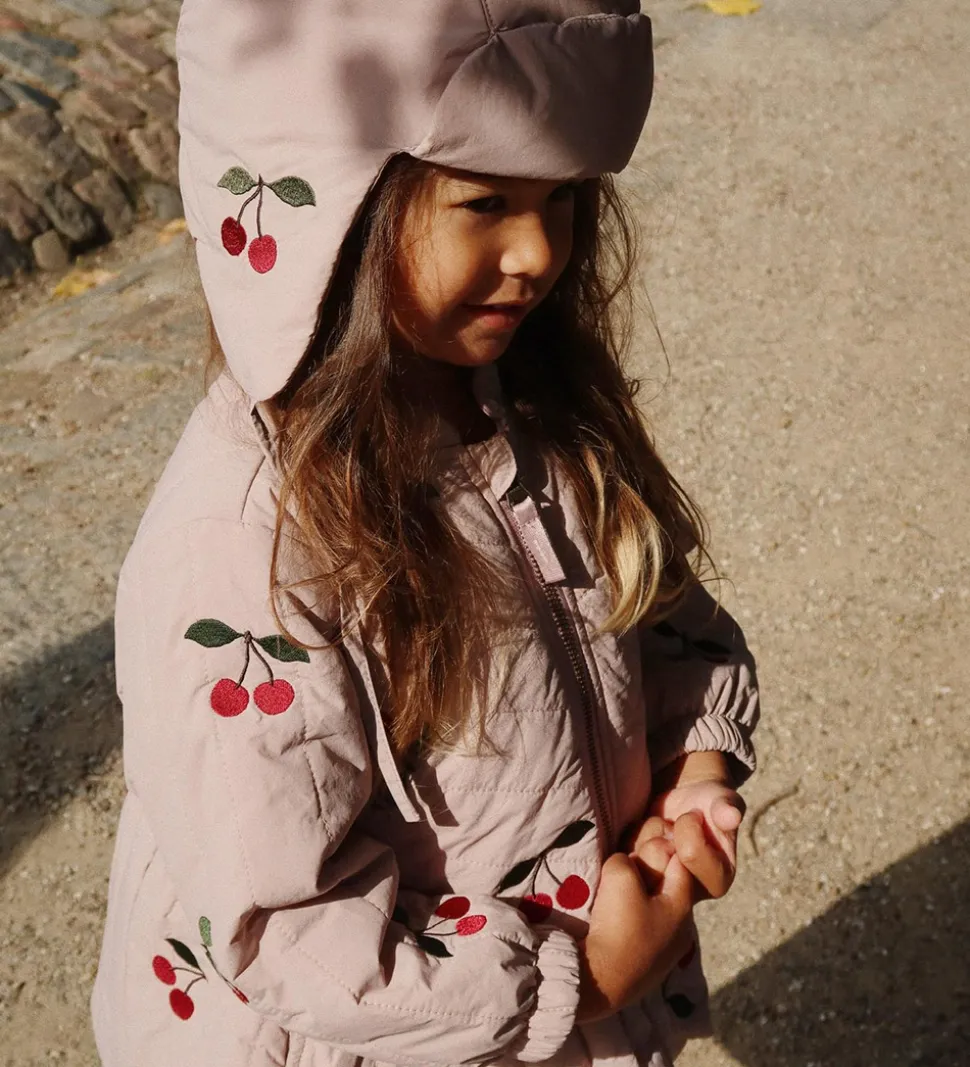 Sød Konges Sløjd termojakke i støvet lilla med broderede kisebær. Termojakken er med en struktur af lodrette syninger.