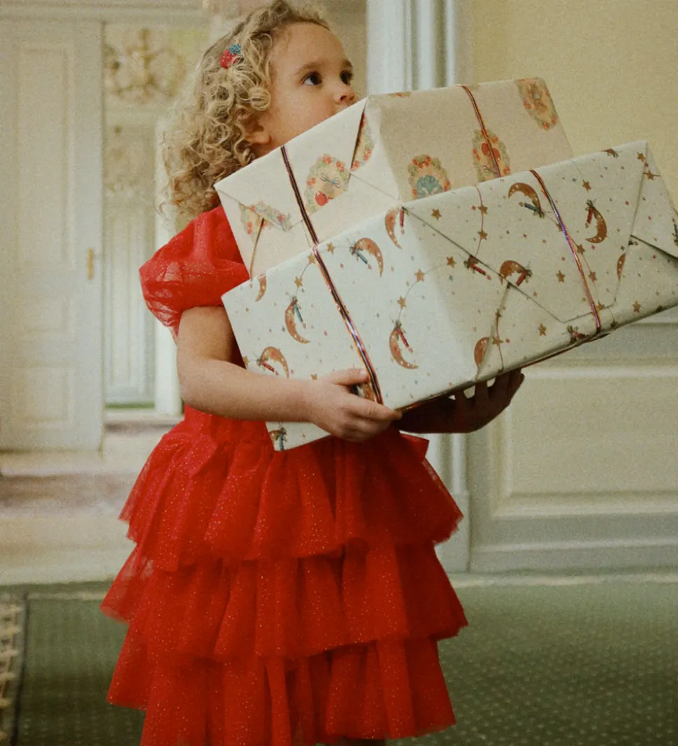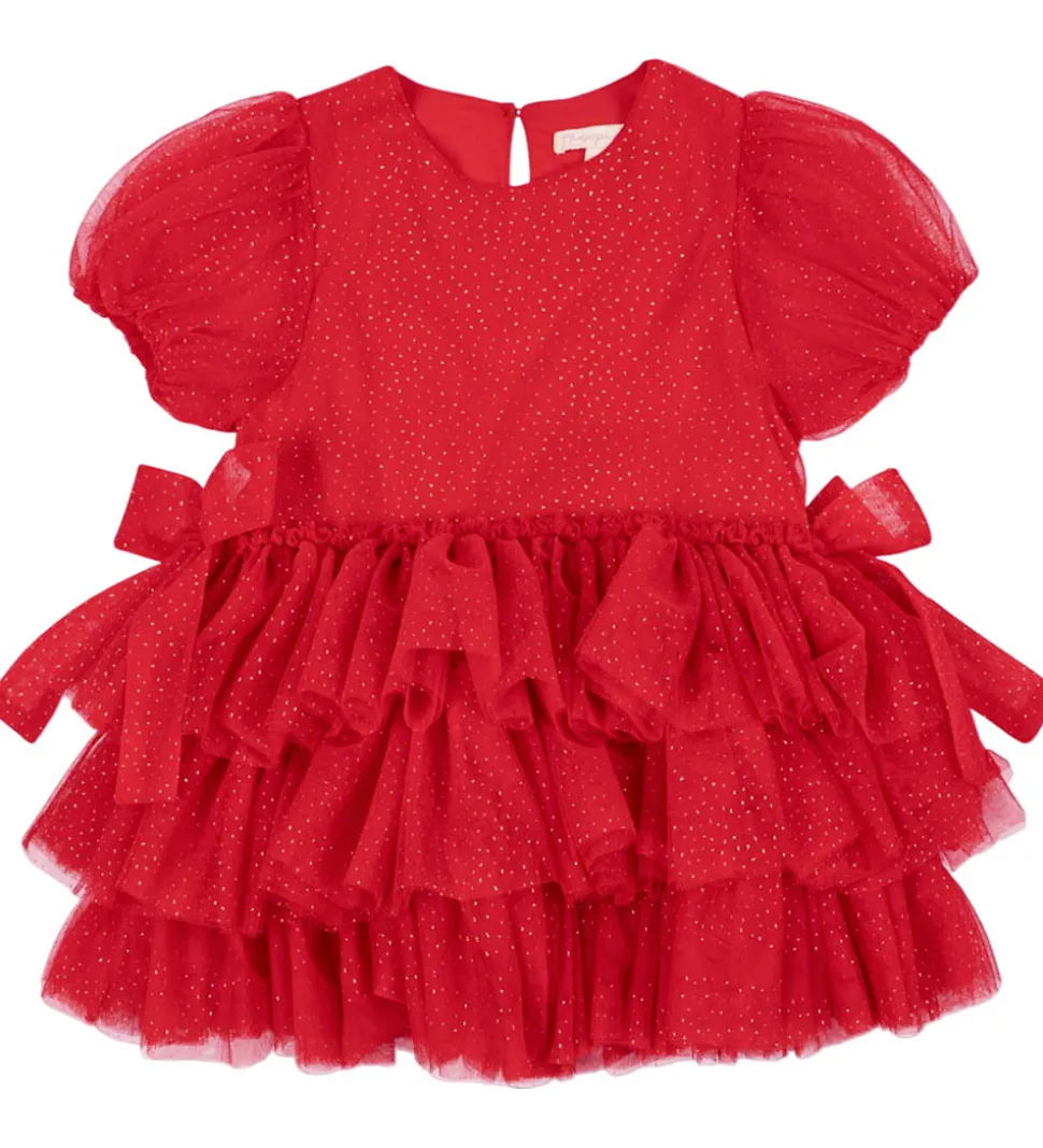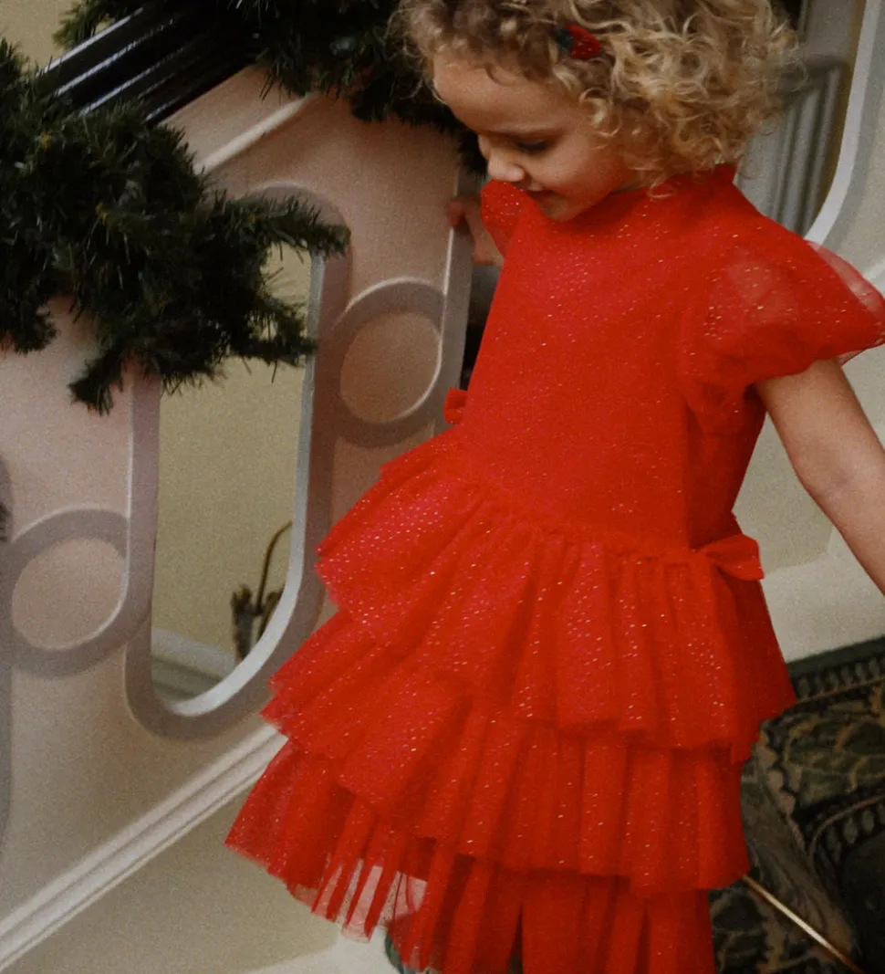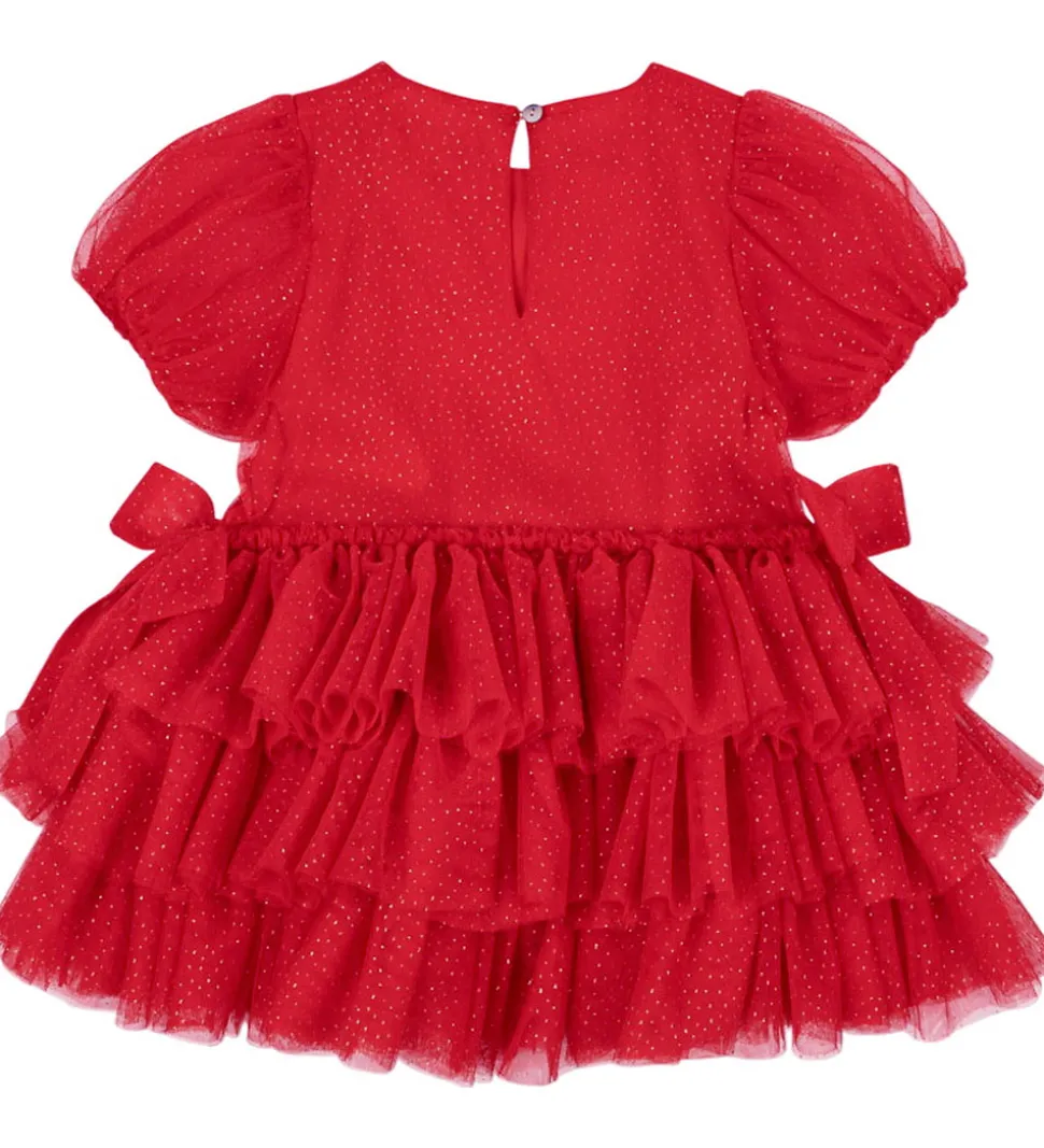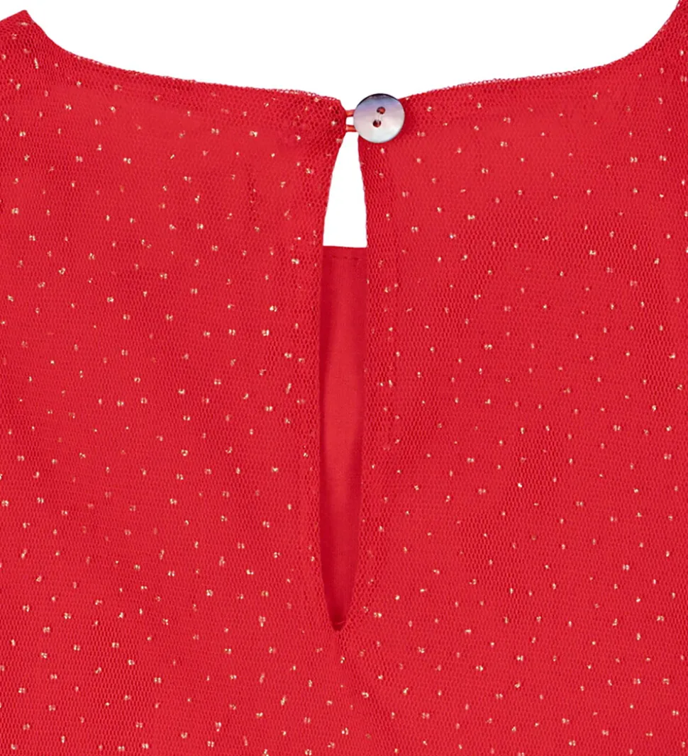 Flot Konges Sløjd kjole i rød med guldprikker. Konges Sløjd kjolen har korte pufærmer med smalle elastikkanter, og skørtet består af flere lag af blødt tyl, som giver en fin struktur. Tylkjolen lukkes i nakken med en med en enkelt knap, og på indersiden er der bomuld.