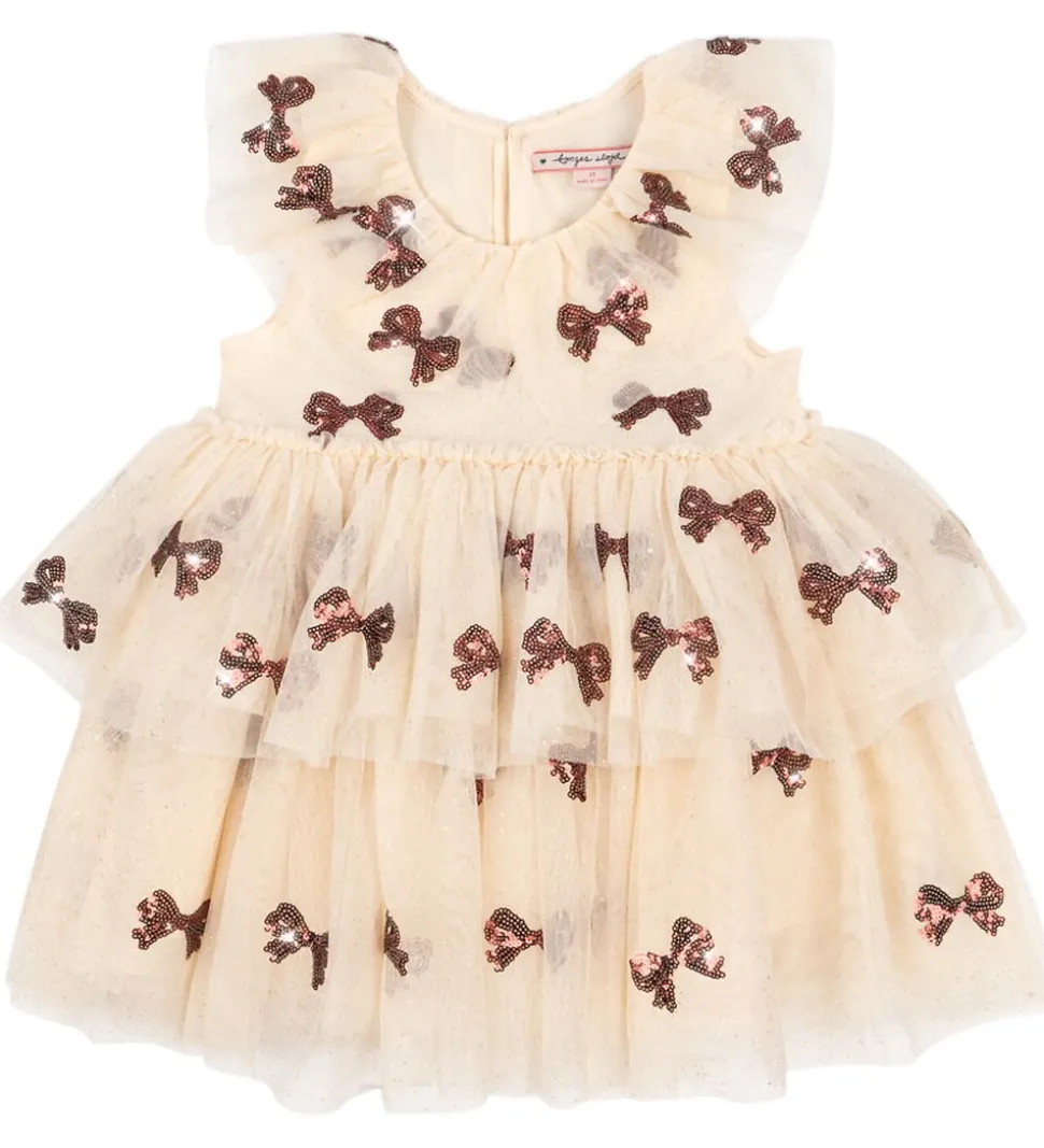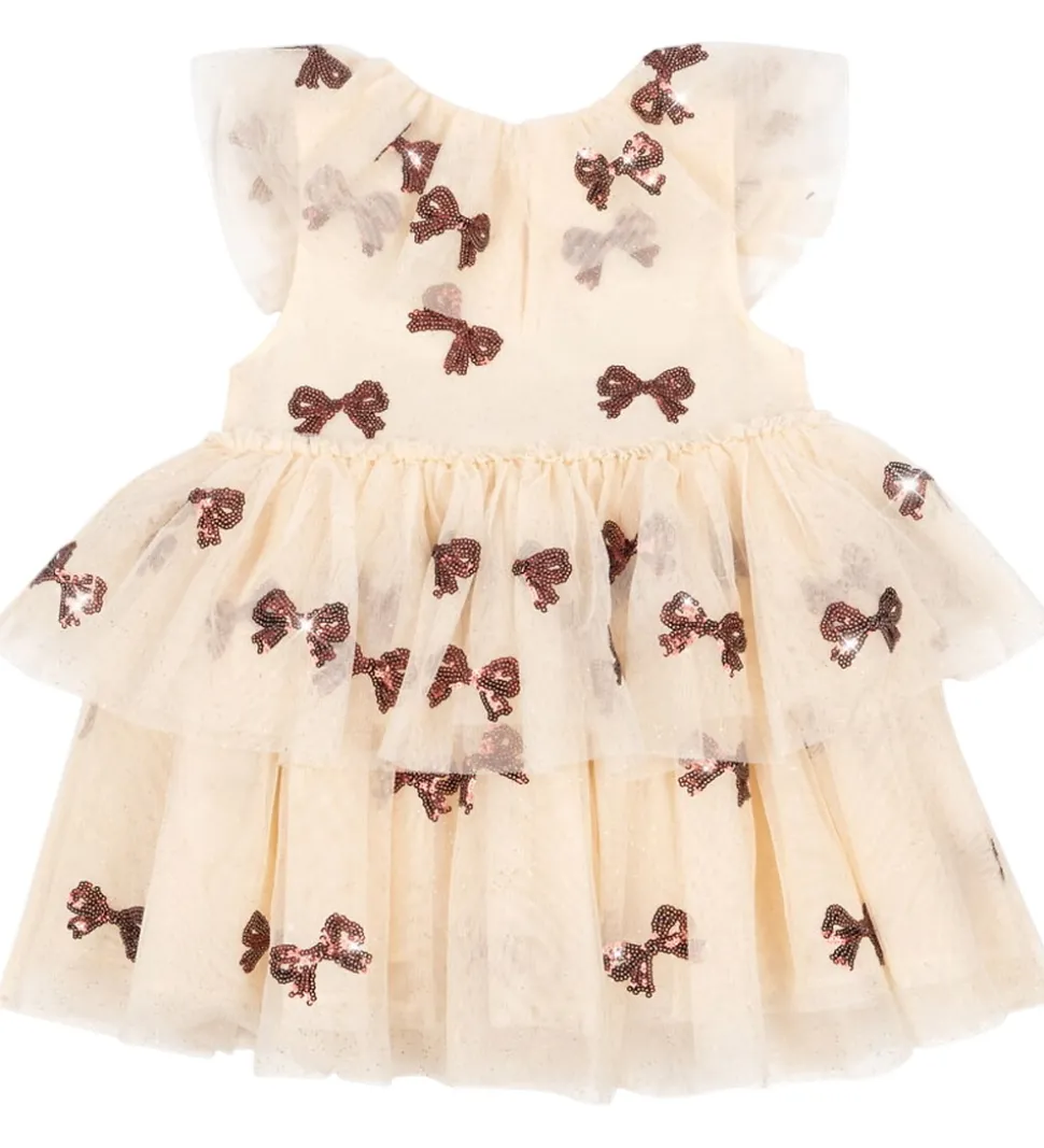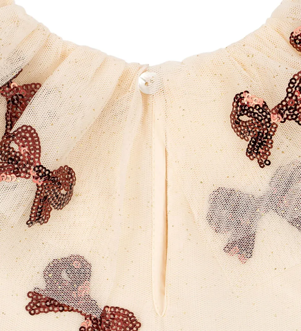 Elegant Konges Sløjd kjole i pudderrosa med guldglimmer og mørkerøde sløjfer lavet af pailletter. Tylkjolen er helt uden ærmer, og den har et skørt med masser flere lag af tyl, der giver en let og luftig effekt. Konges Sløjd kjolen lukkes i nakken med en knap, og den har bomuld på indersiden.