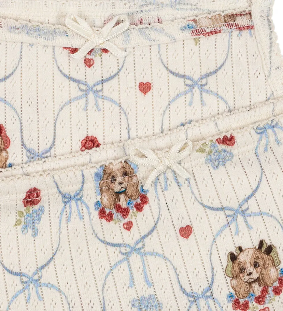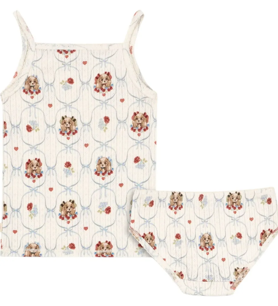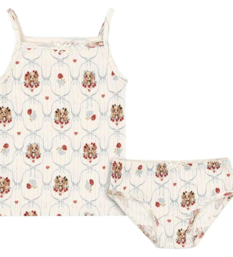Charmerende Konges Sløjd undertøj i lysebeige med et sødt print af små hunde og blomster i rosa og blå nuancer. Konges Sløjd sættet består af en undertrøje med smalle stropper og et par matchende trusser, der fuldender looket.
