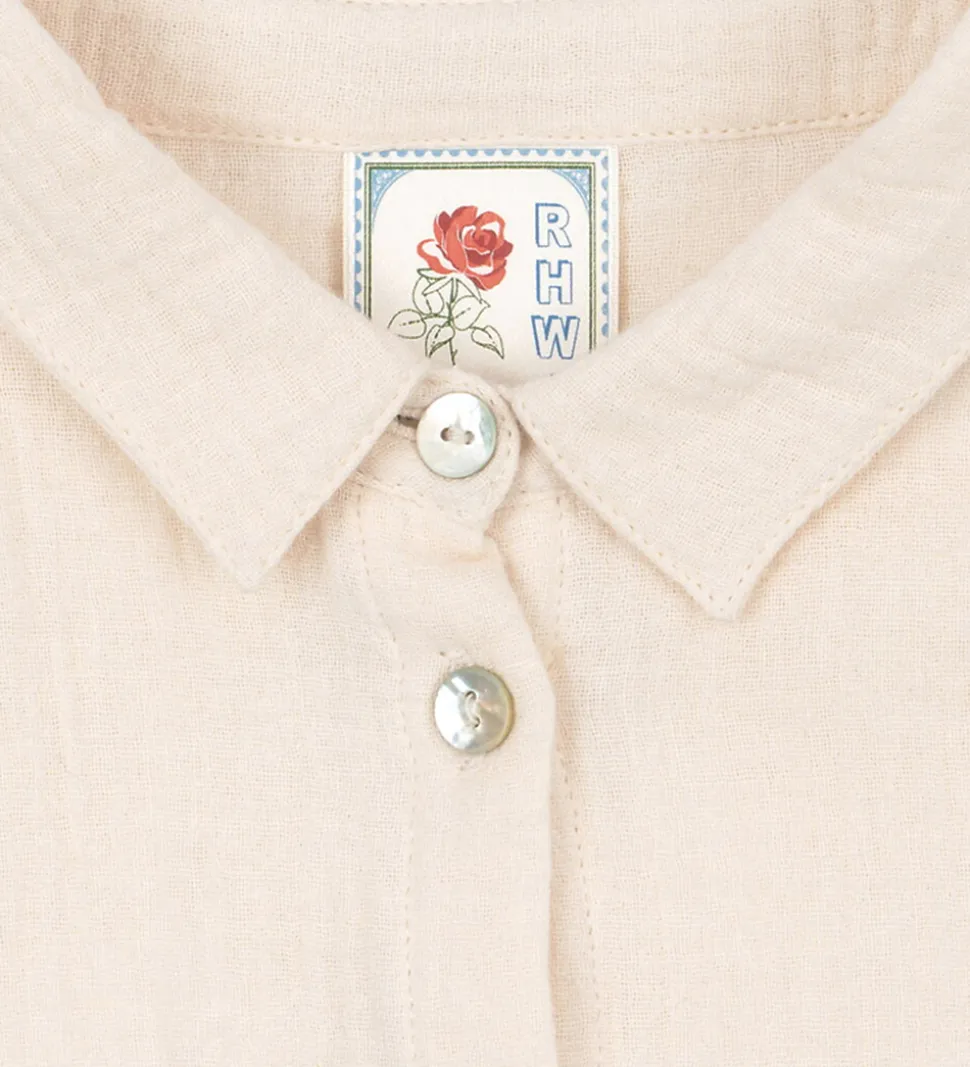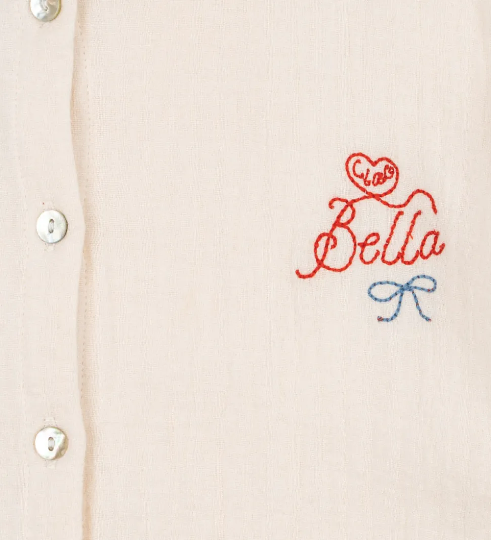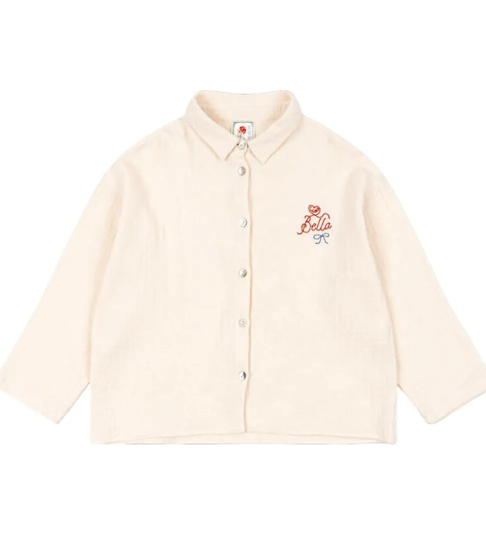 Charmerende Konges Sløjd skjorte i lys cremefarvet med musselinstruktur. På venstre bryst er teksten “Ciao Bella” broderet i rød. Skjorten har lange ærmer og en klassisk skjortekrave. Den lukkes fortil med gennemgående knapper.