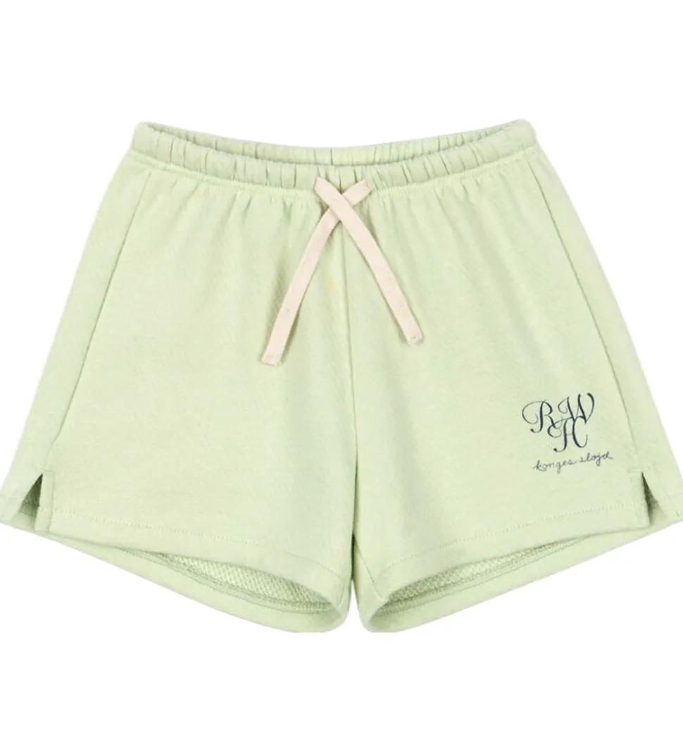 Lækre sweatshorts fra Konges Sløjd i mintgrøn med mørkeblåt logoprint på venstre lår. Shortsene har en elastisk talje med justerbare snøre for optimal pasform og små slidser i siderne.