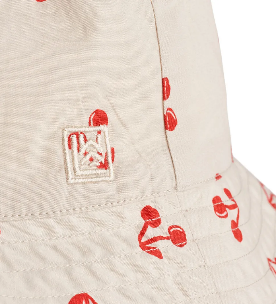 Sød Liewood bøllehat i et vendbart design, hvor den ene side er beige med rødt kirsebærprint, mens den anden er i ensfarvet beige.