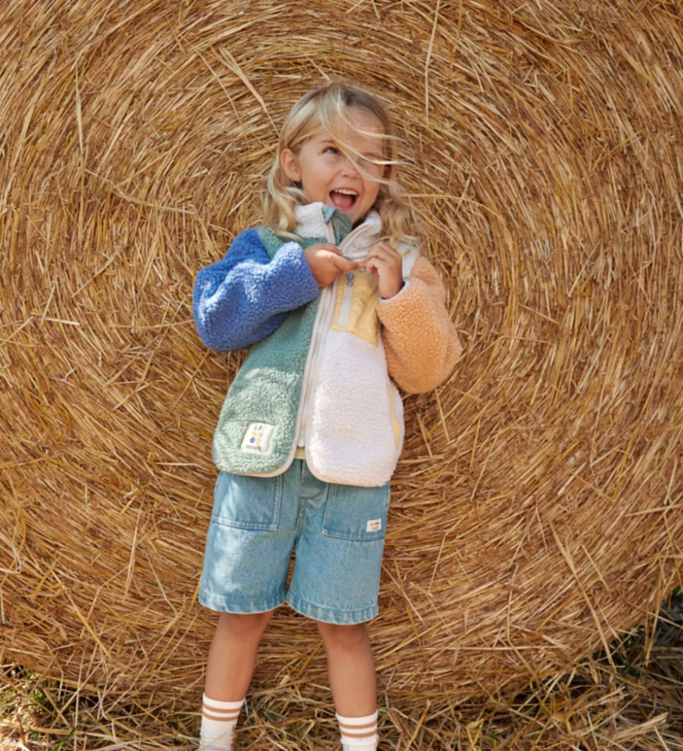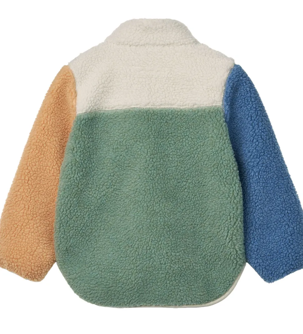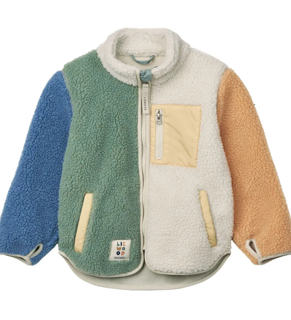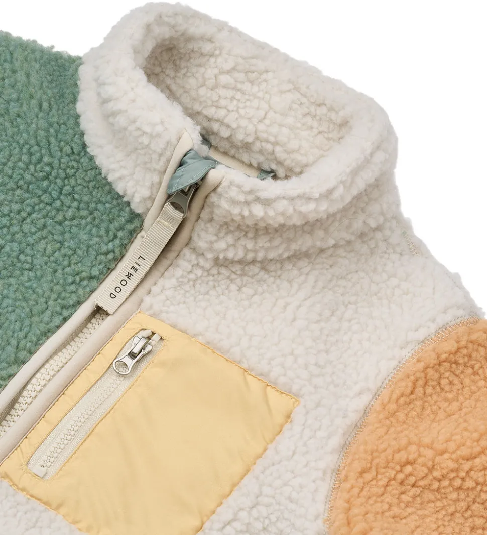 Sej Liewood fleecejakke i teddyfleece i en farvesammensætning af hvid, støvet grøn, blå, lys orange og gul.