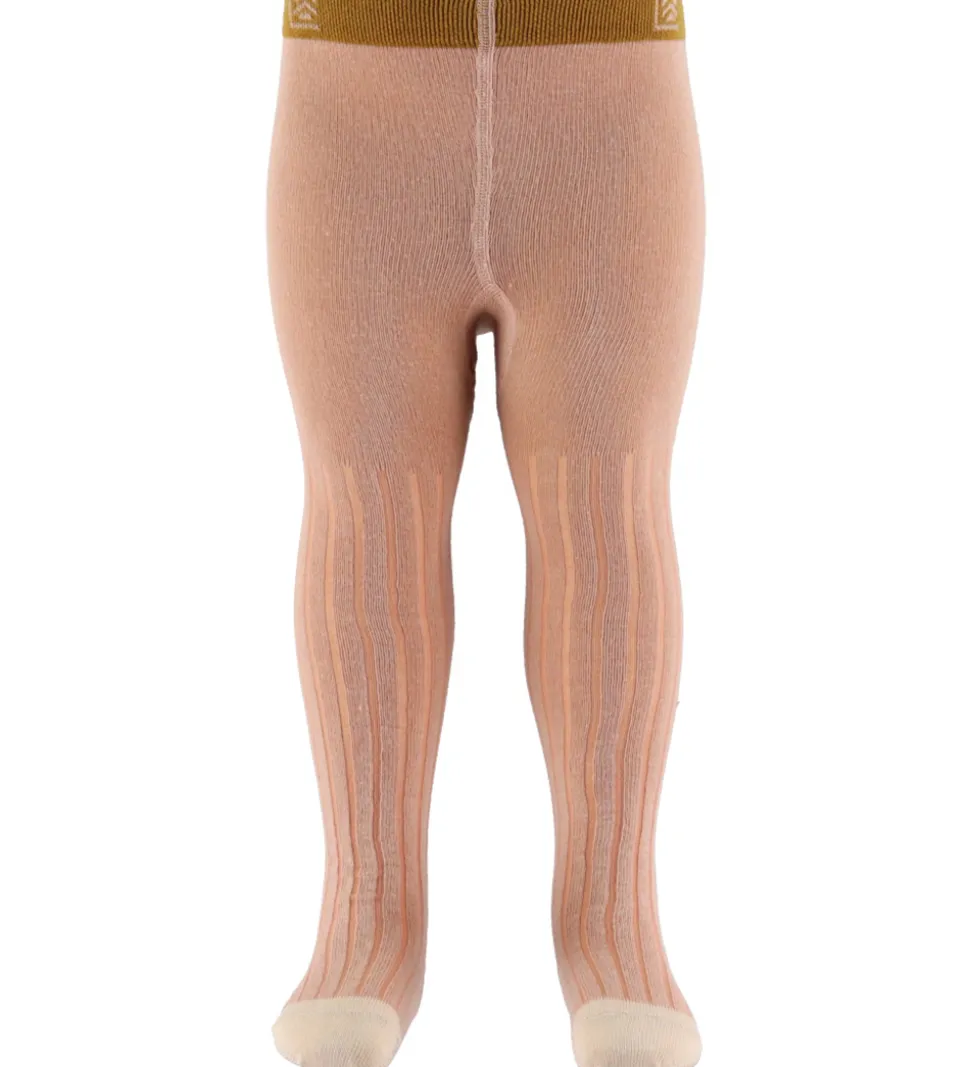 Fine Liewood strømpebukser i støvet rosa med en flot ribstruktur, og på hælene er de mørk rosa, på tæerne pudderrosa og i livet karrygule.