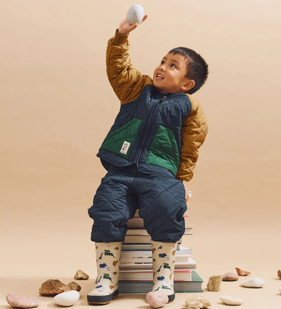 Flot termotøj fra Liewood med et moderne quiltet mønster i dyb blå farve. Termojakken har kontrastærmer i en varm karrygul nuance, der skaber et unikt look. To rummelige lommer i grøn tilføjer praktisk opbevaring. Termojakken er designet med ribkant ved ærmerne og har en lynlåslukning med indvendig vindstolpe.