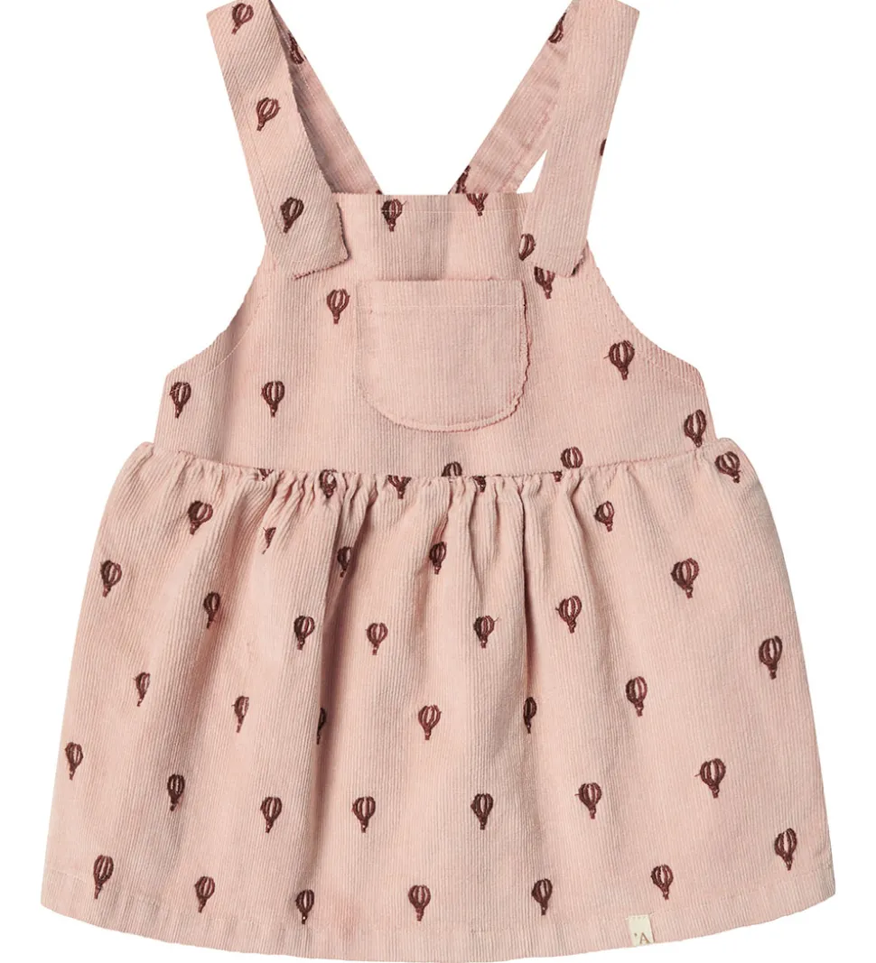 Elegant Lil Atelier kjole i rosa fløjl med et alloverprint af broderede luftballoner i mørkerød. Lil Atelier kjolen har smalle skulderstropper, som knappes fortil. I ryggen er der en elastik, som gør det nemt at få kjolen af og på. Fortil er der en lille lomme.