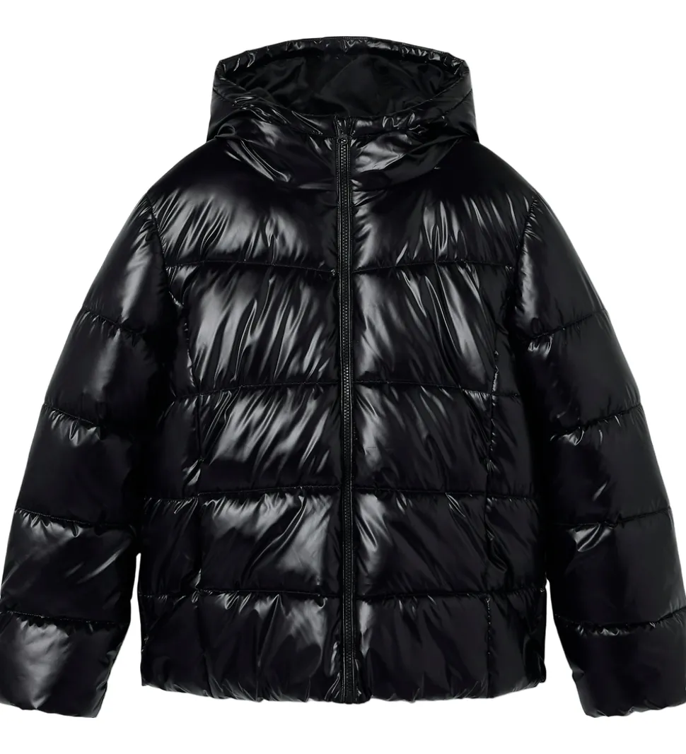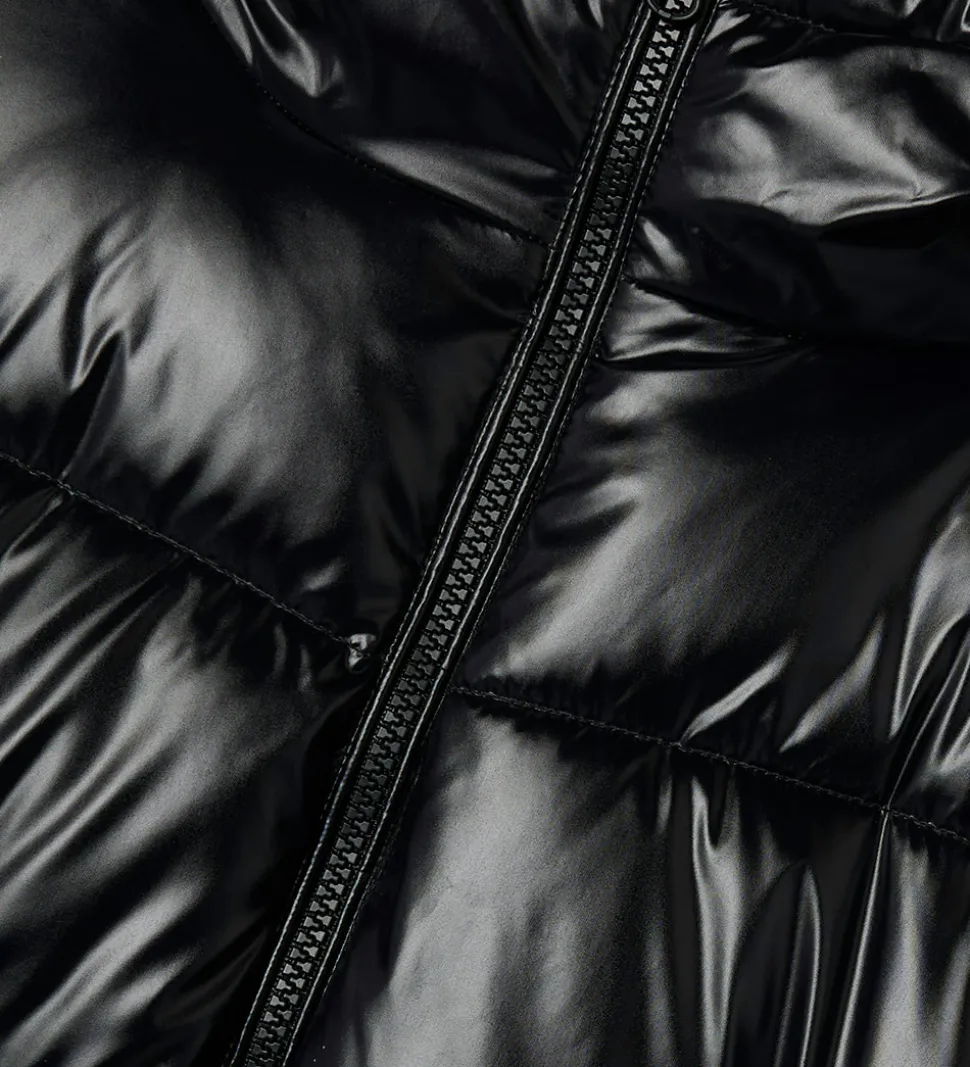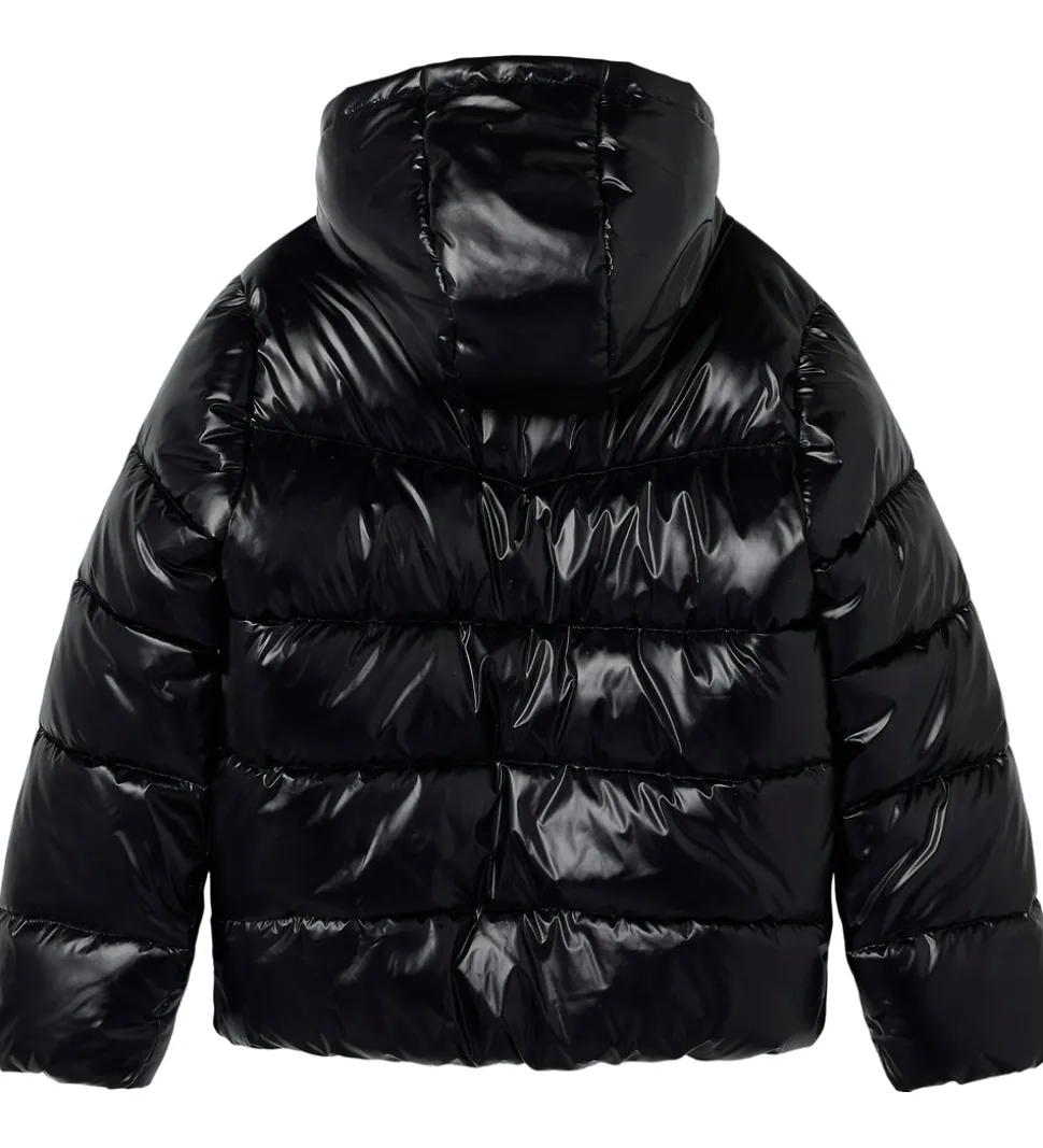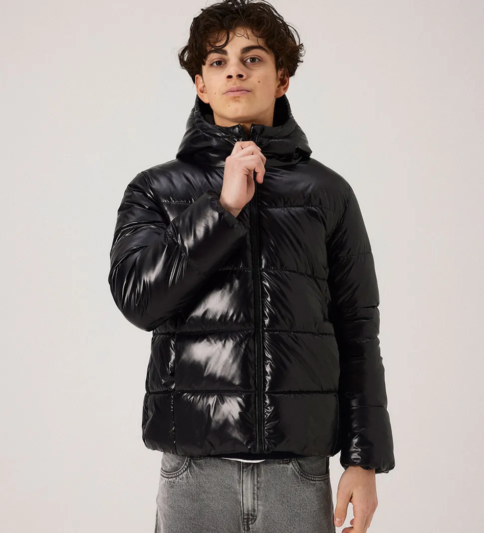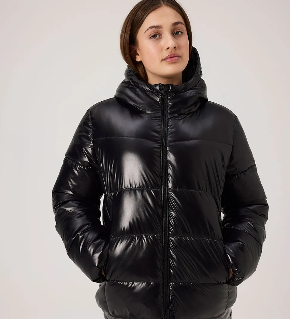 Lækker LMTD dynejakke i ensfarvet sort med en skinnende overflade.
