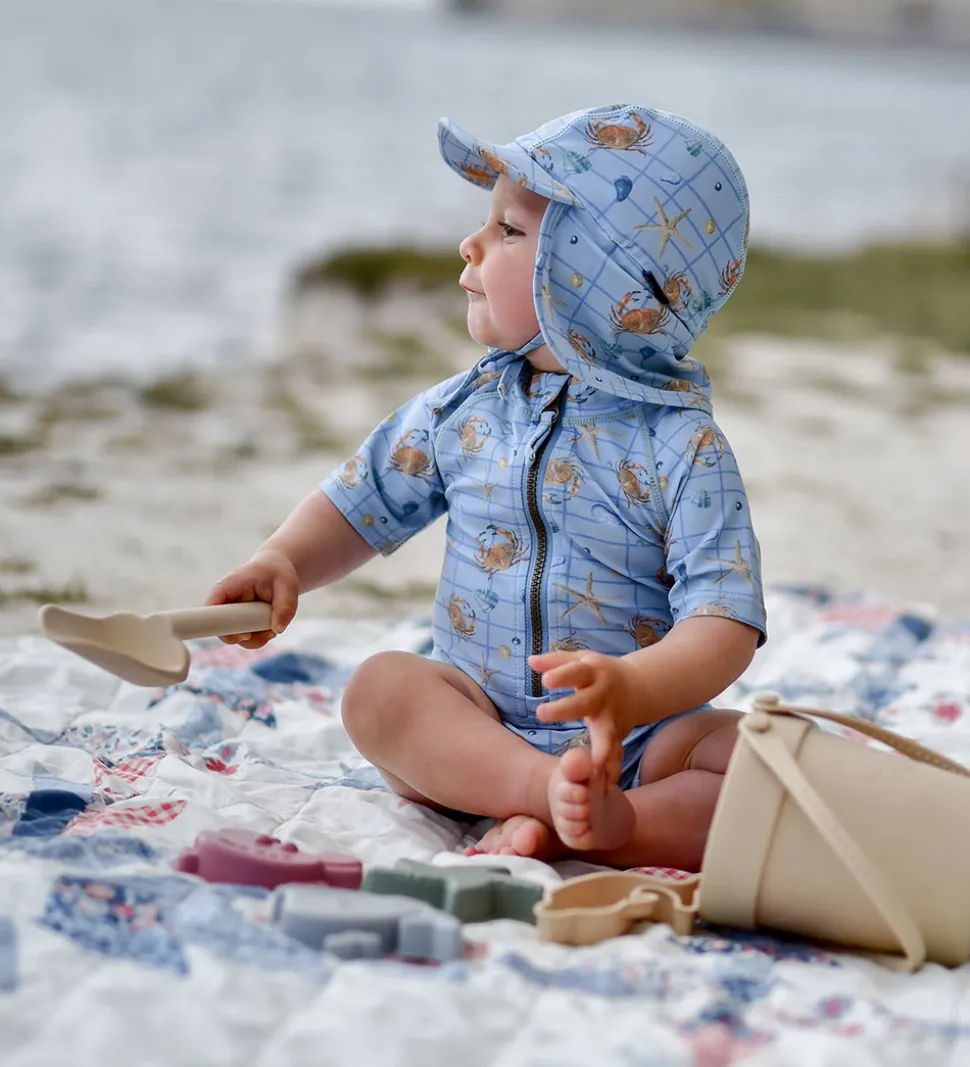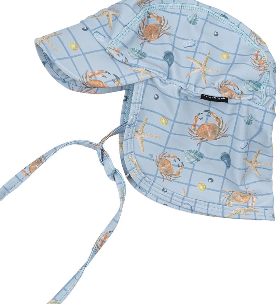 Charmerende Mikk-Line badehat i en flot lyseblå med et sjovt print af krabber, søstjerner og muslingeskaller. Mikk-Line badehatten har en praktisk skygge og bindebånd under hagen for sikker pasform.