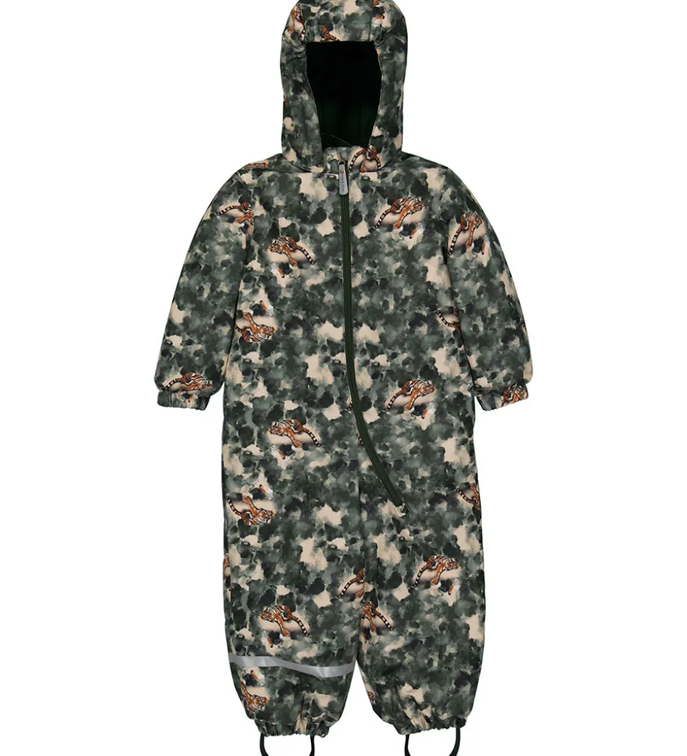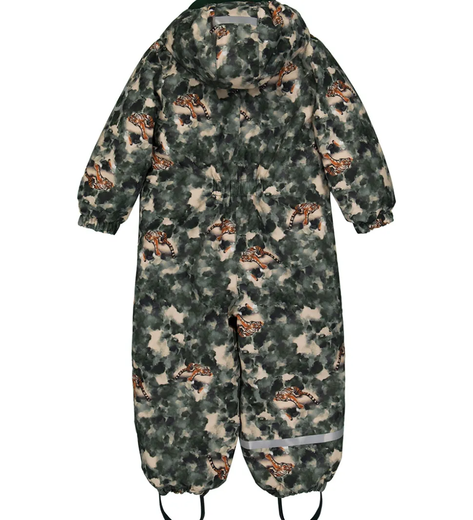 Sej Mikk-Line flyverdragt med et alloverprint af tigere og former som ligner skyer i råhvid og grønne nuancer. Flyverdragten har refleksdetaljer på hætten, venstre ærme og højre ben.