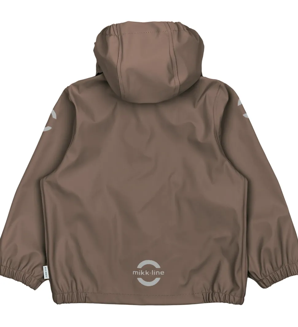 Flot Mikk-Line regntøj bestående af en regnjakke og et par regnbukser i ensfarvet, brun PU.
