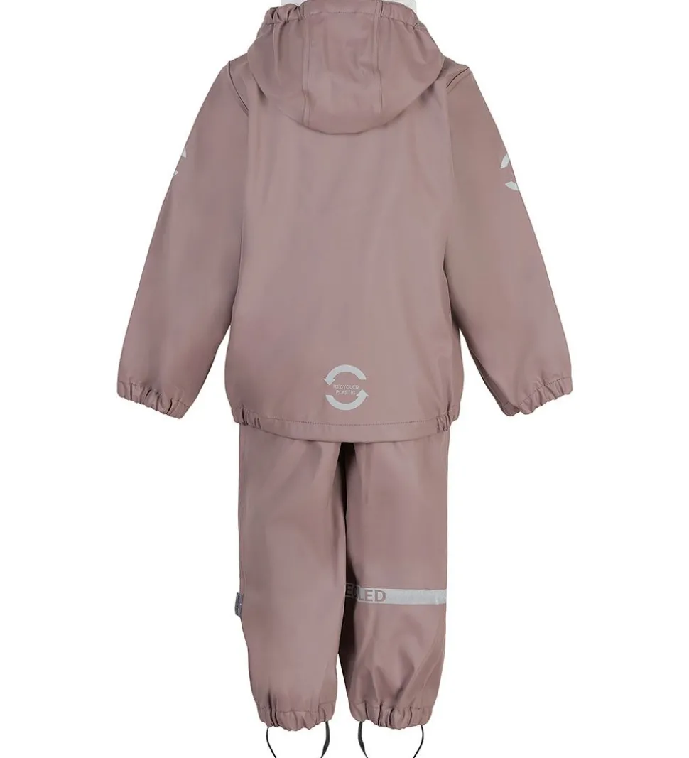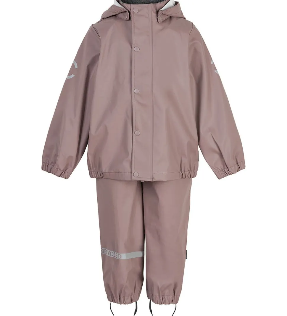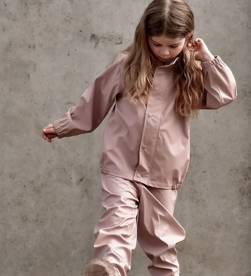 Yndigt Mikk-Line regntøj bestående af en regnjakke og et par regnbukser i ensfarvet, rosa PU.