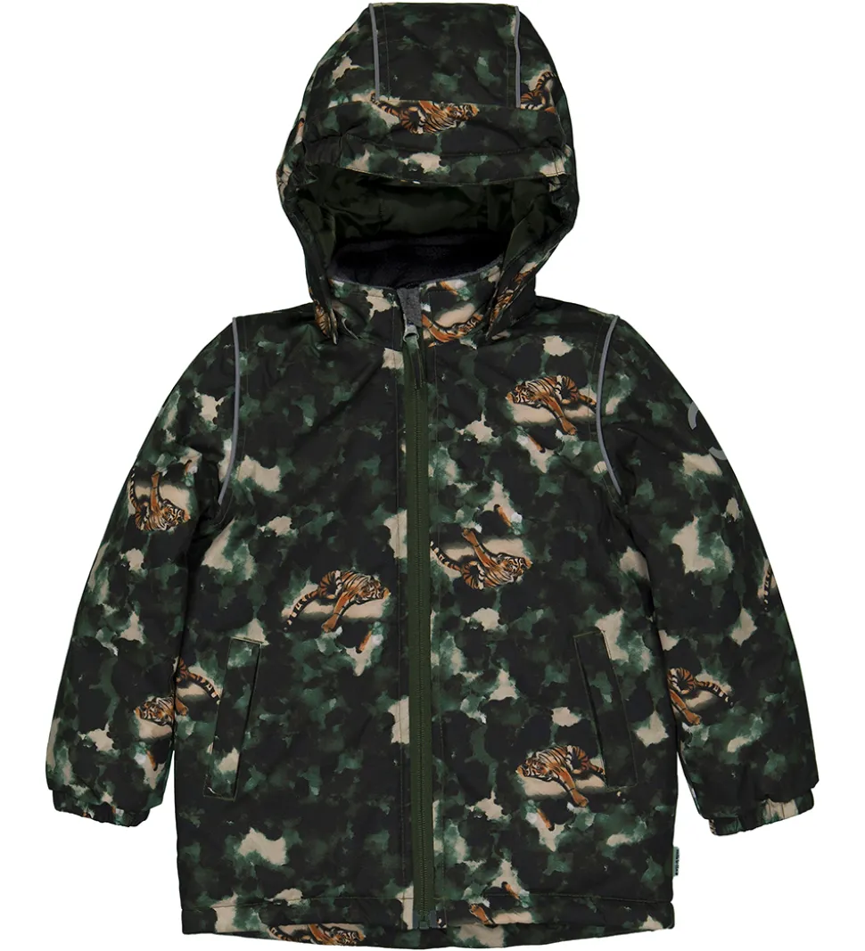 Skøn Mikk-Line vinterjakke med et camouflageprint i grønne og beige nuancer og med tigere.