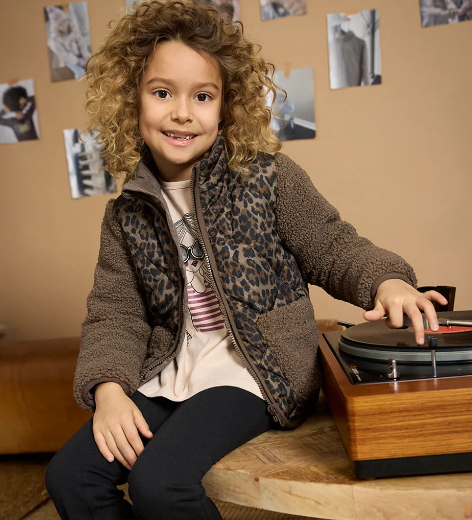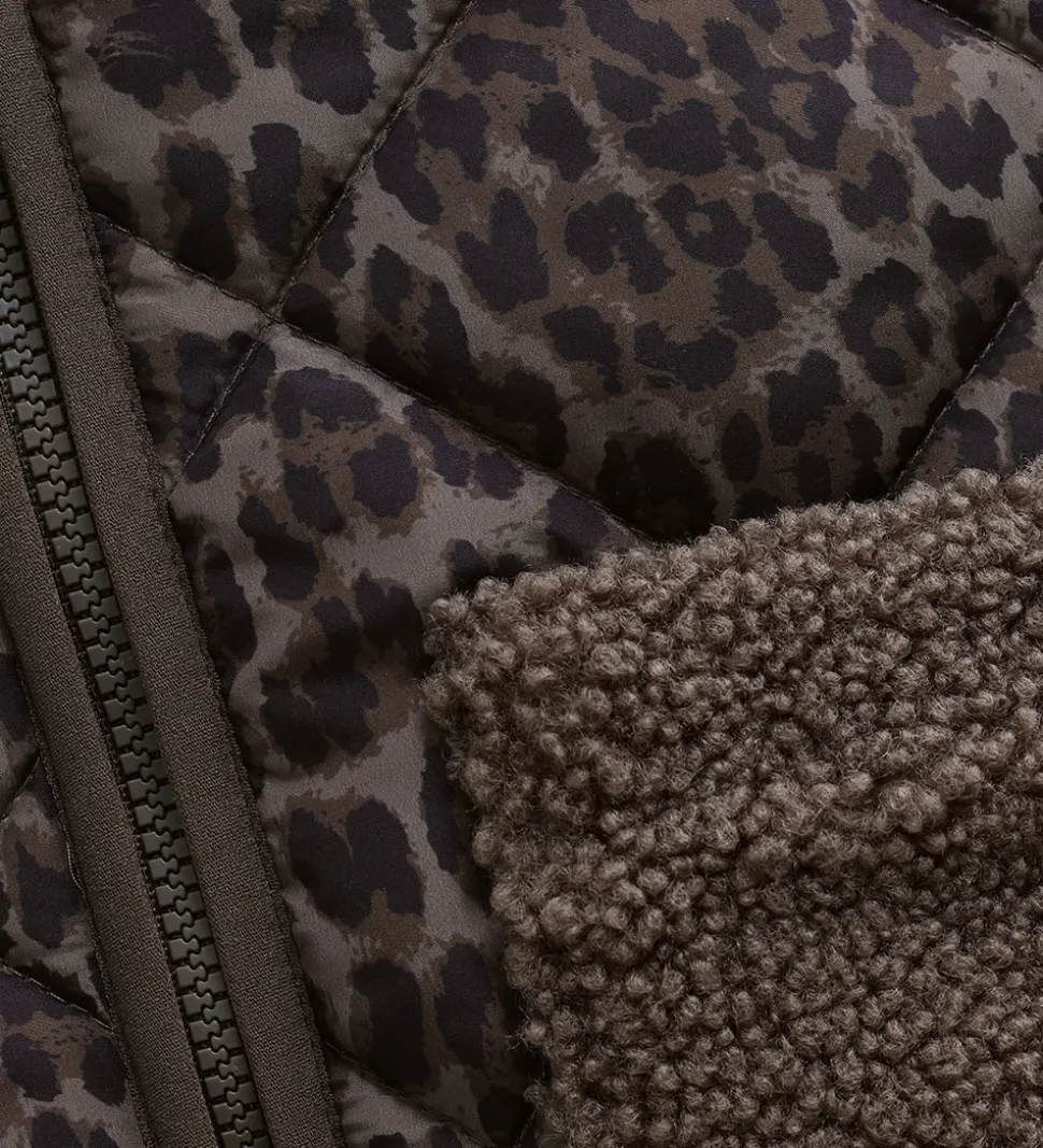 Smart Minymo jakke i brun med et leopardprint i sort og rune nuancer. Jakken er lavet i en glatvævet kvalitet med en quiltet struktur, og ærmerne og lommerne er lavet af brunt teddyfleece.