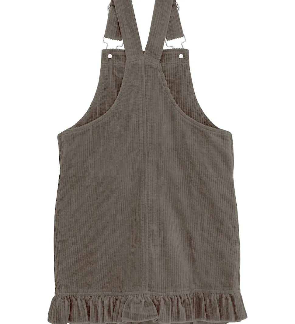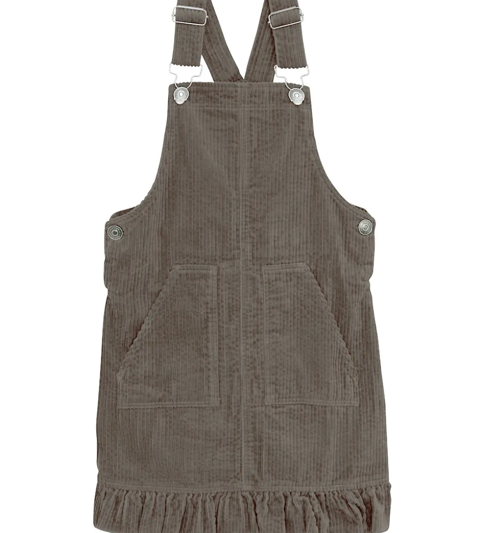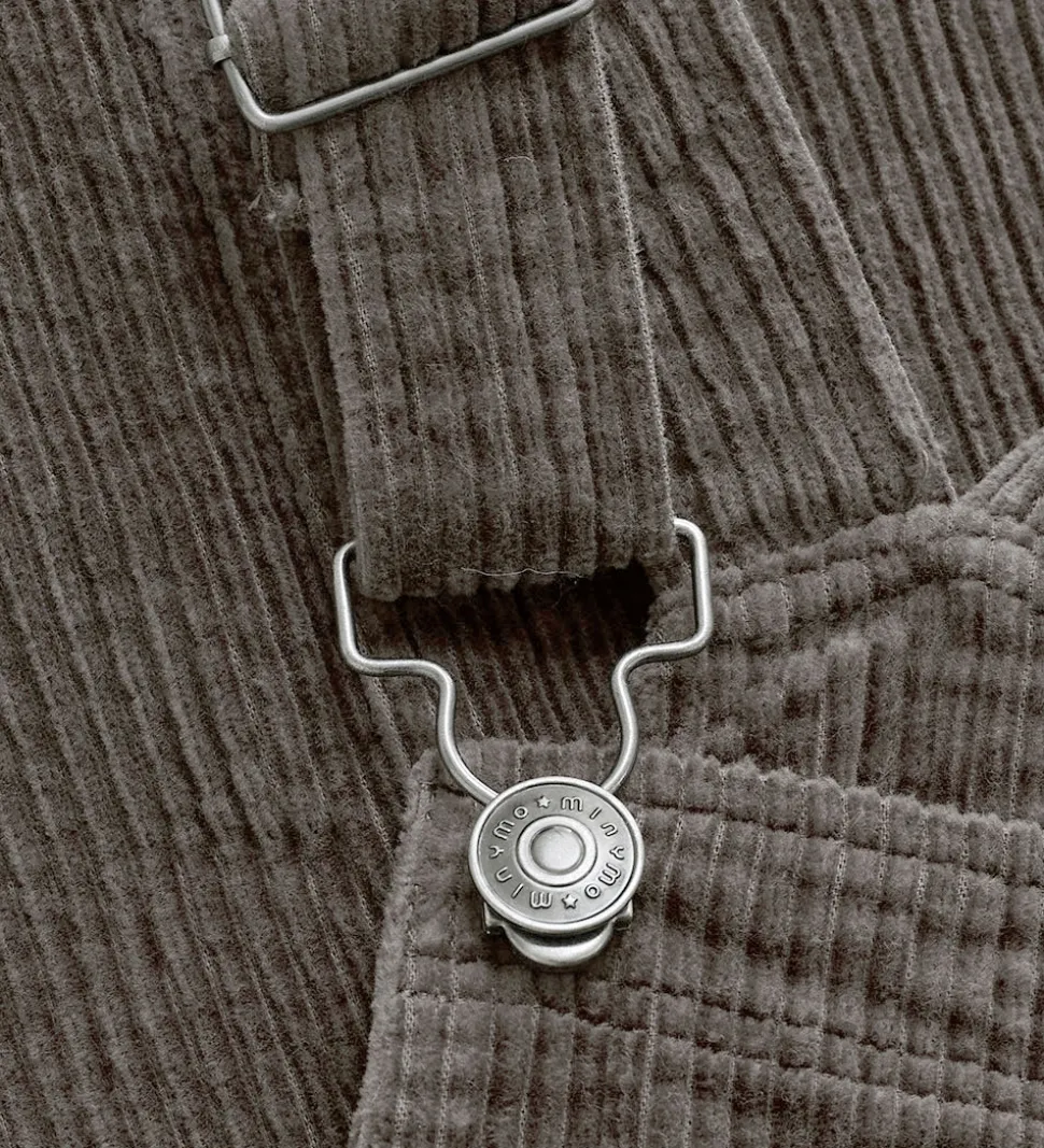 Fin Minymo spencer i brunt fløjl. Minymo kjolen har justerbare seler og praktiske lommer foran. Spenceren har knapper i siderne, så den er let at få på. Nederst er der en flot flæsekant.