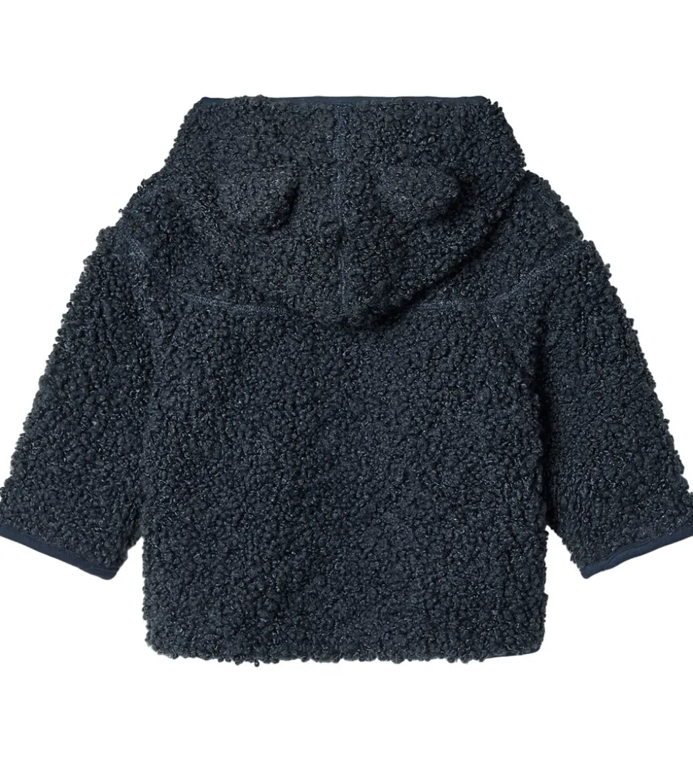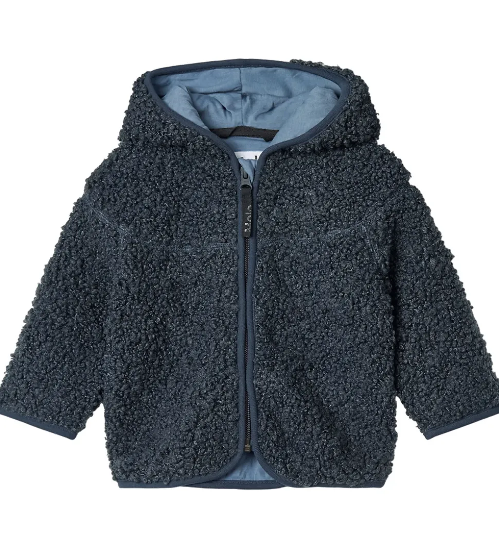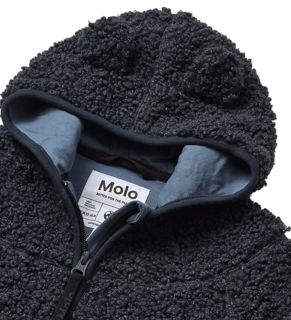 Stilren Molo fleecejakke i mørkeblå teddyfleece. Fleecejakken har en praktisk hætte og lange ærmer, som giver en behagelig pasform. Fleecejakken åbnes fortil med en lynlås, der har en hagebeskytter for ekstra sikkerhed.