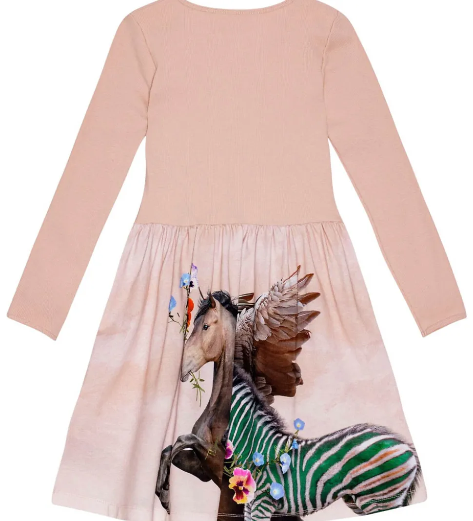 Elegant Molo kjole i en sart rosa nuance. Molo kjolen har lange ærmer og en rund halsudskæring. Skørtet er dekoreret med en fascinerende collage af en hest og en zebra samt forskellige blomster, der skaber et spændende visuelt udtryk.