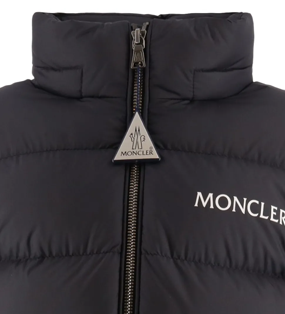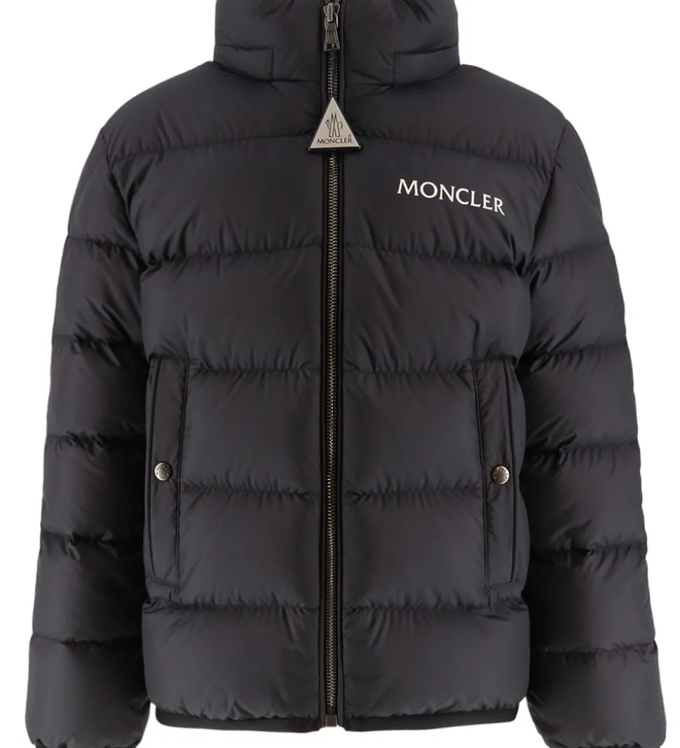 Lækker Moncler dunjakke i ensfarvet sort, med teksten Moncler på venstre bryst, og øverst på venstre ærme er der et filt-mærke med et Moncler-logo.