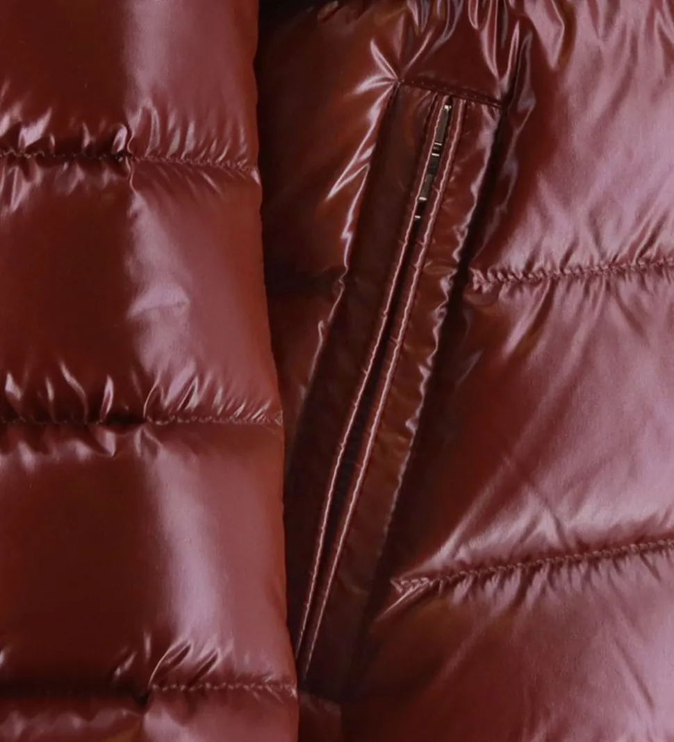 Smart Moncler dunjakke i bordeauxrød, og øverst på venstre ærme er der et filt-mærke med et Moncler-logo.