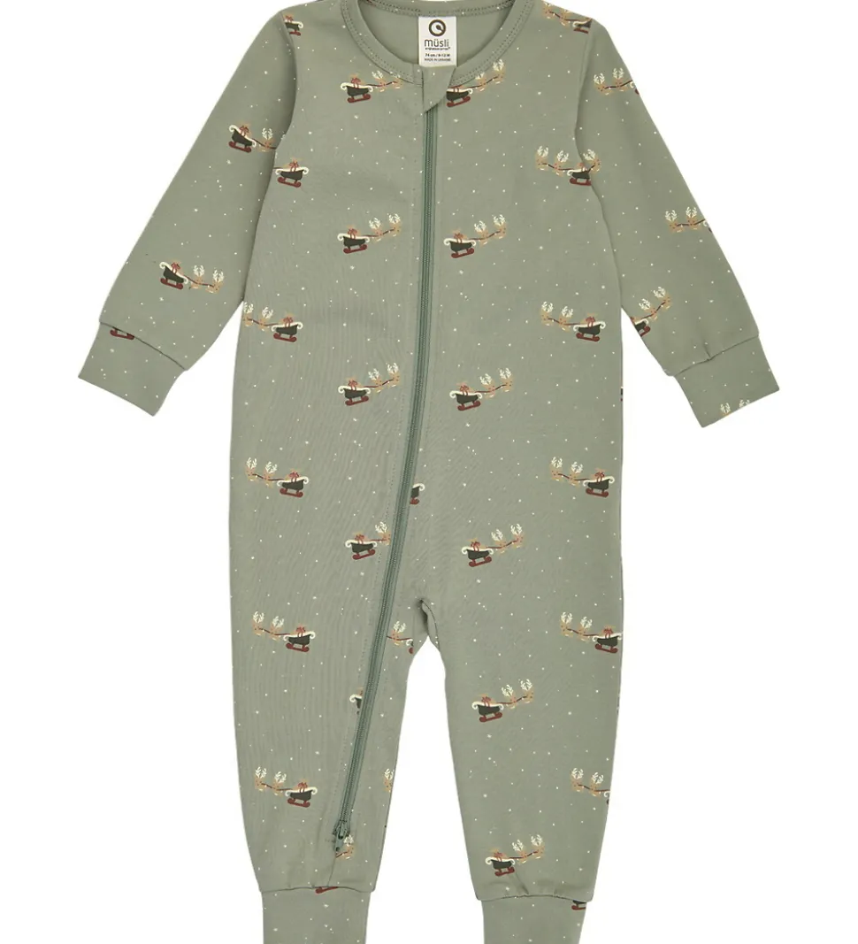 Charmerende heldragt fra Müsli i en støvet grøn nuance med et julet print af rensdyr og små prikker.