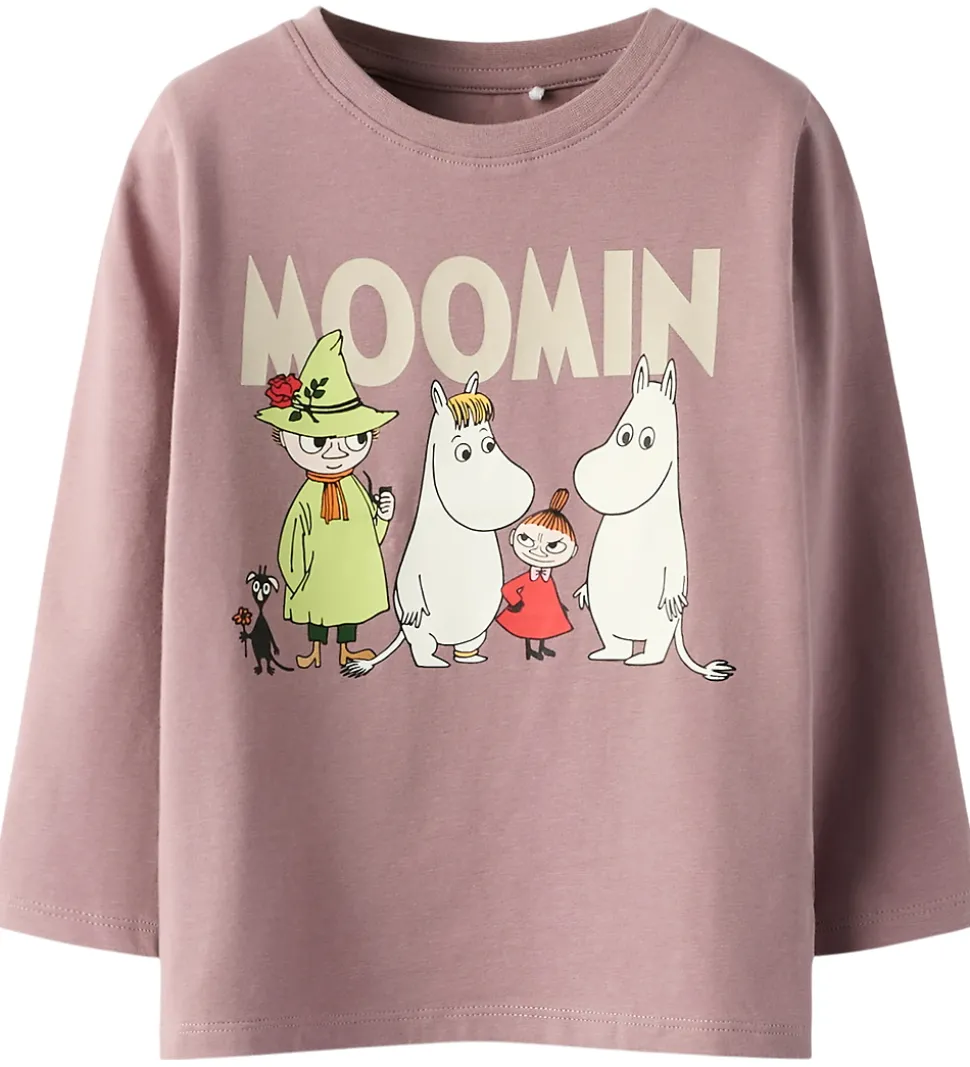 Charmerende Name It bluse i lilla med print af Mumitroldene på fronten i fine farver. Blusen har en rund halsudskæring med en smal ribkant og lange ærmer.