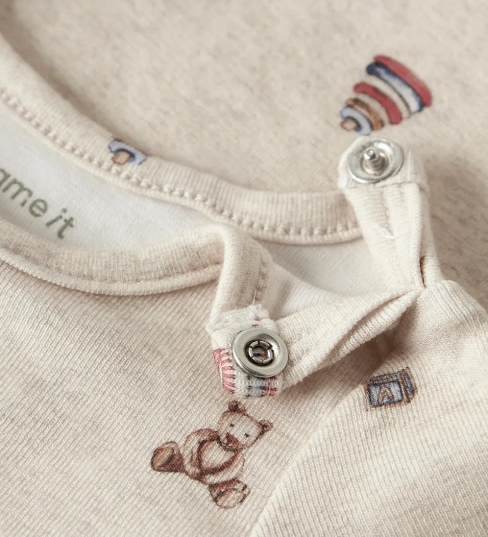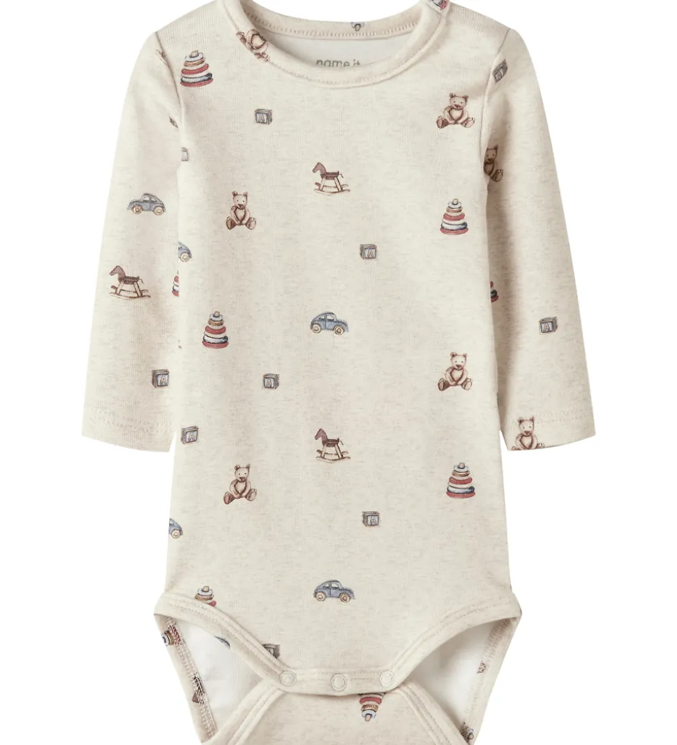 Skøn Name It body i meleret beige med et alloverprint af forskelligt legetøj. Bodyen har en rund halsudskæring med en trykknap ved venstre skulder og lange ærmer. Den lukkes mellem benene med trykknapper.