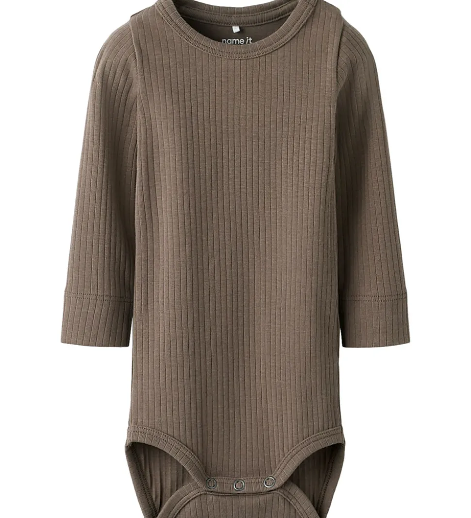Flot Name It body i en varm brun nuance med ribstruktur. Bodyen har lange ærmer og en rund halsudskæring med en trykknap ved venstre skulder. Bodyen lukkes mellem benene med trykknapper.