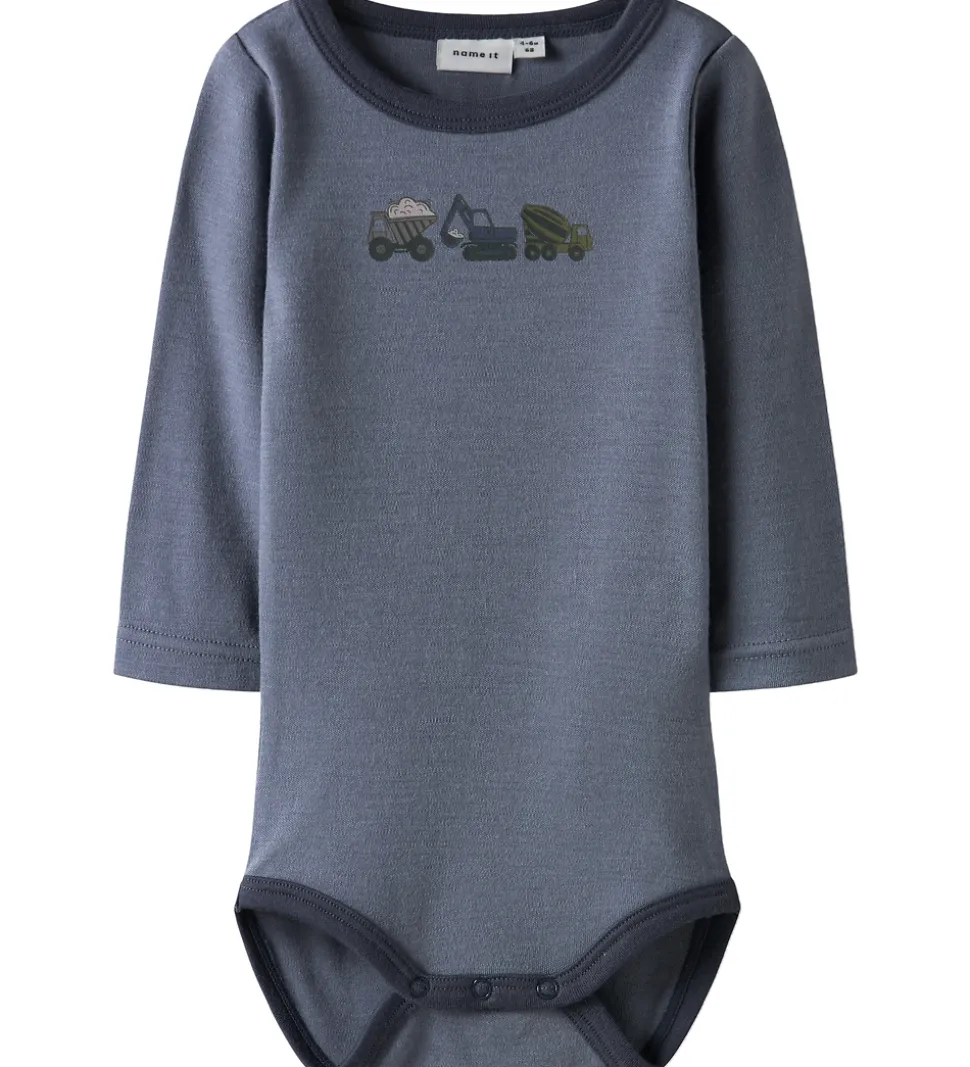Blød Name It body i støvet blå med et print på brystet af tre arbejdsmaskiner. Bodyen har mørkeblå kanter. Den har en rund halsudskæring og lange ærmer, og lukkes mellem benene med trykknapper. Bodyen er fremstillet i lækkert merinould.