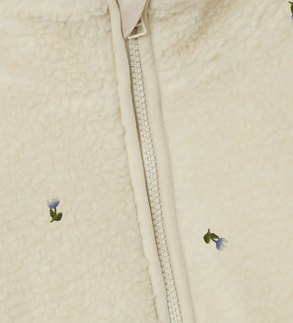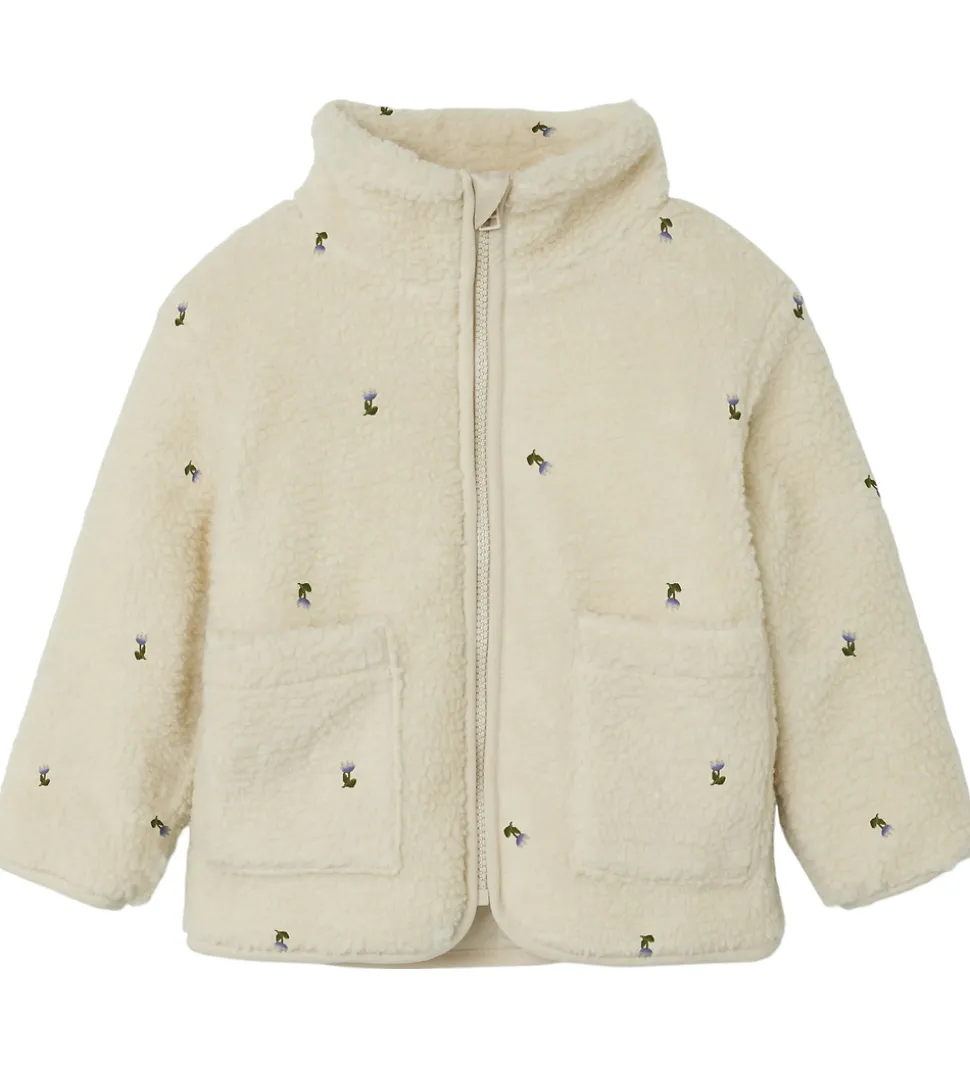 Dejlig Name It fleecejakke i blødt, cremefarvet teddyfleece med små, broderede blomster.