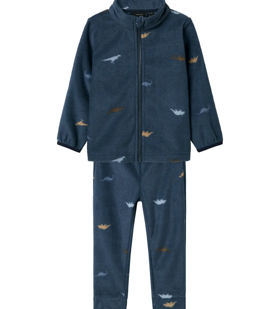 Charmerende Name It fleecesæt i en mørkeblå nuance med små dinoer i forskellige farver spredt over hele overfladen. Sættet består af en fleecetrøje og et par fleecebukser.