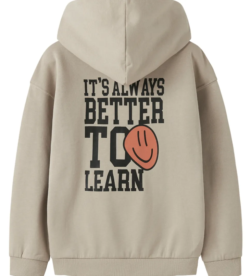 Stilren hættetrøje fra Name It i en lys beige. Hættetrøjen prydes af et iøjefaldende print på brystet med teksten “Society School” i sort. Name It hættetrøjen har en praktisk kængurulomme på fronten samt ribkanter ved håndleddene og i livet. Indvendigt har hættetrøjen blødt børstet bomuld.