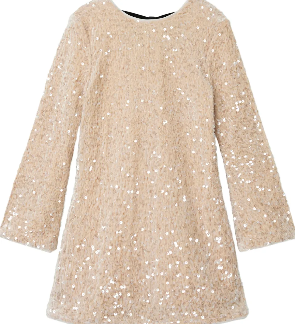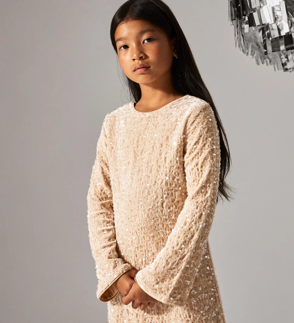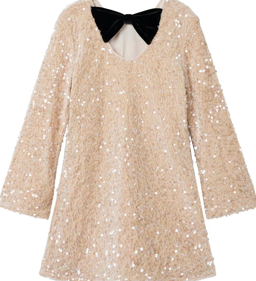 Elegant Name It kjole i beige velour med fine palietter. Kjolen har en rund halsudskæring med en sort sløjfe i nakken og en dyb rygudskæring. Den har lange ærmer med god vidde ved håndleddene. Kjolen har et flot A-snit og består af to lag.