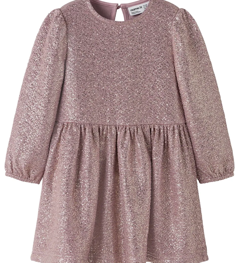 Elegant Name It kjole i rosa med skinnende glimmer. Kjolen har en rund halsudskæring med en knap i nakken. Den har lange ærmer med puf ved skuldrene og elastik ved håndleddene. Kjolen er skåret ved taljen, hvor skørtet får rynker og ekstra volumen.