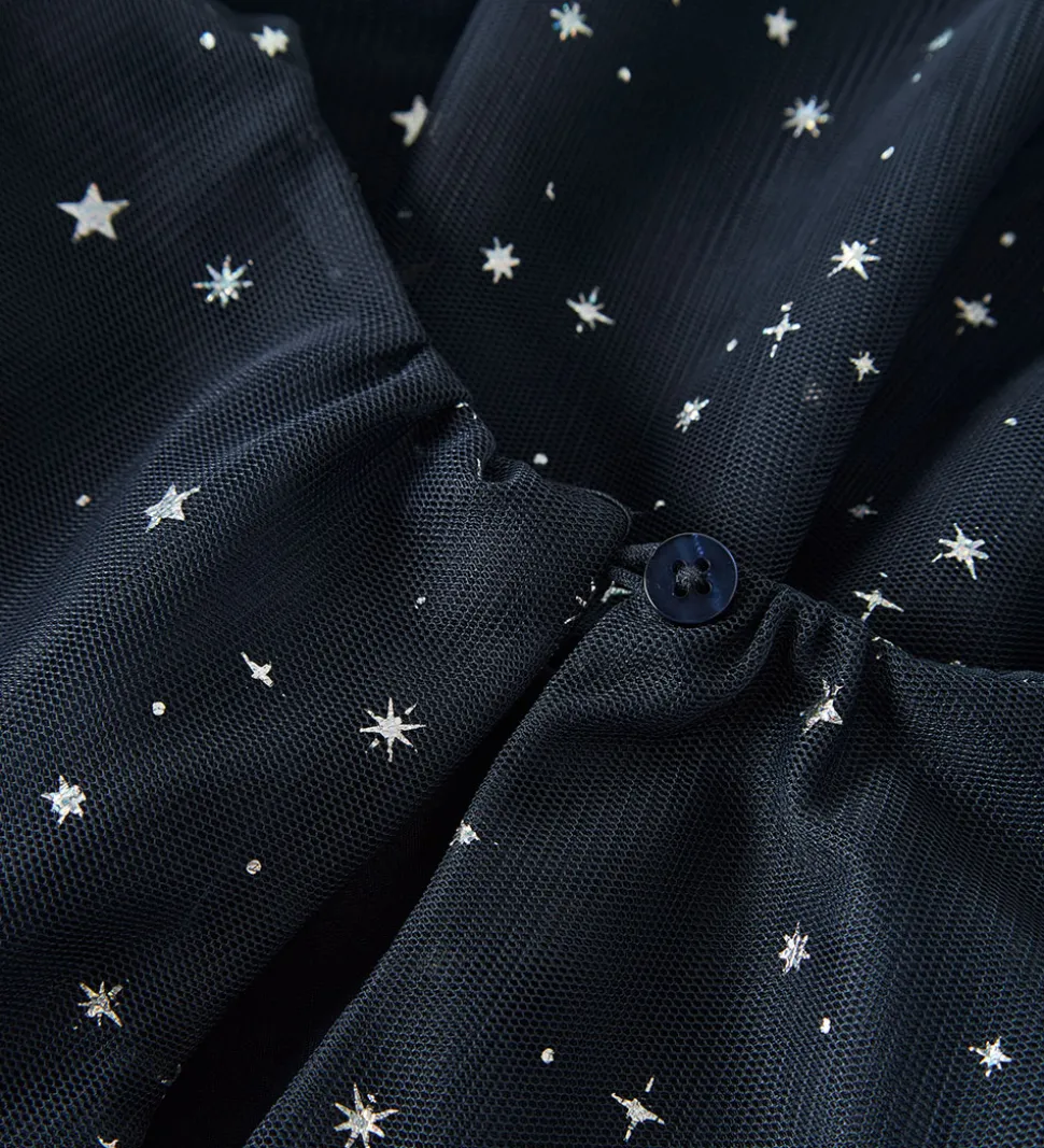 Elegant Name It kjole i navyblå med stjerner i sølv glimmer. Name It kjolen er ærmeløs, og har en rund halsudskæring med en knap i nakken. Kjolen består af et lag genanvendt polyester inderst og to lag tyl yderst.
