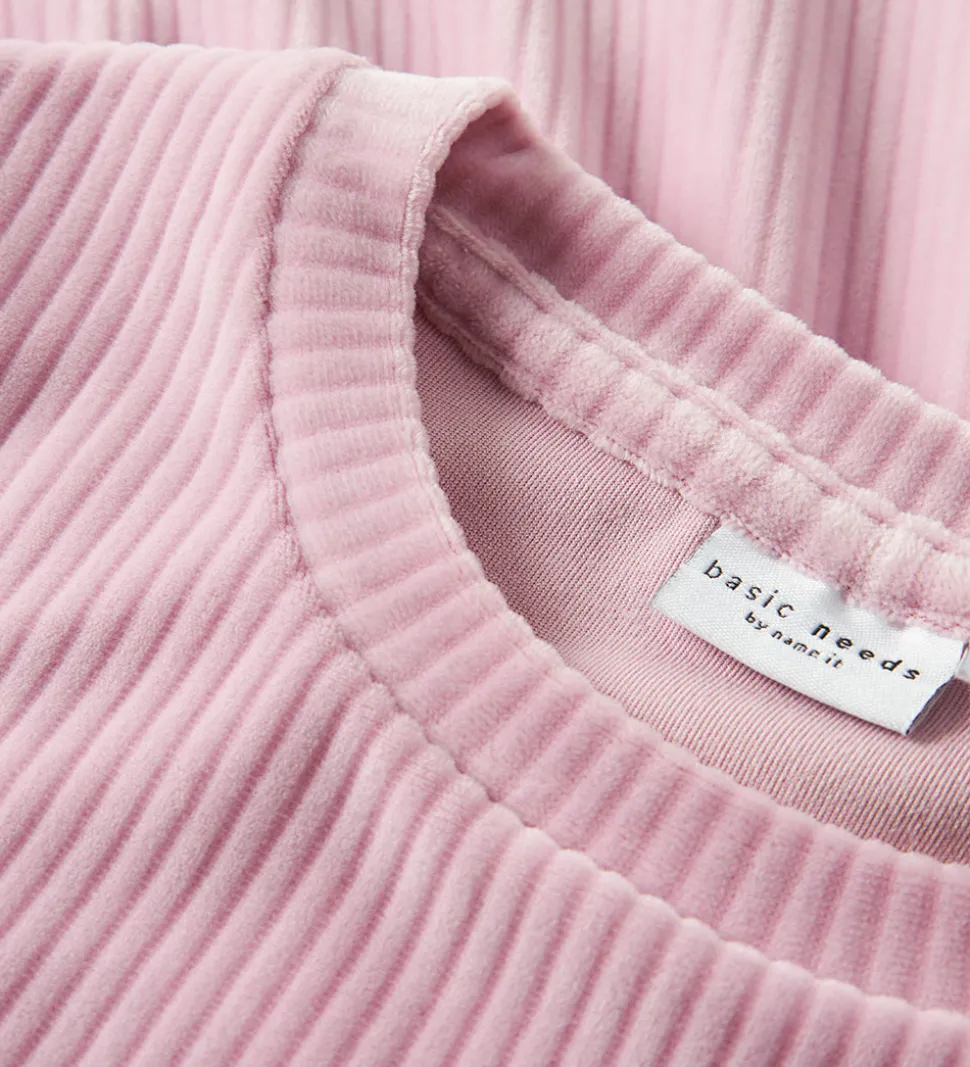 Behagelig Name It kjole i en sart, lyserød nuance. Name It kjolen har lange ærmer og en rund halsudskæring. Kjolen har en blød velour-struktur, der giver et elegant udtryk, mens nederdelen er skåret i et blødt og fyldigt design.