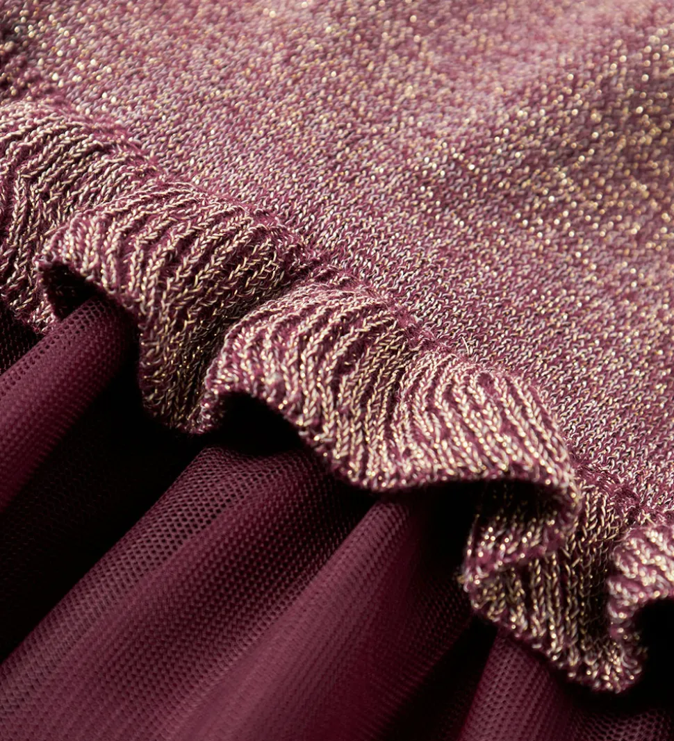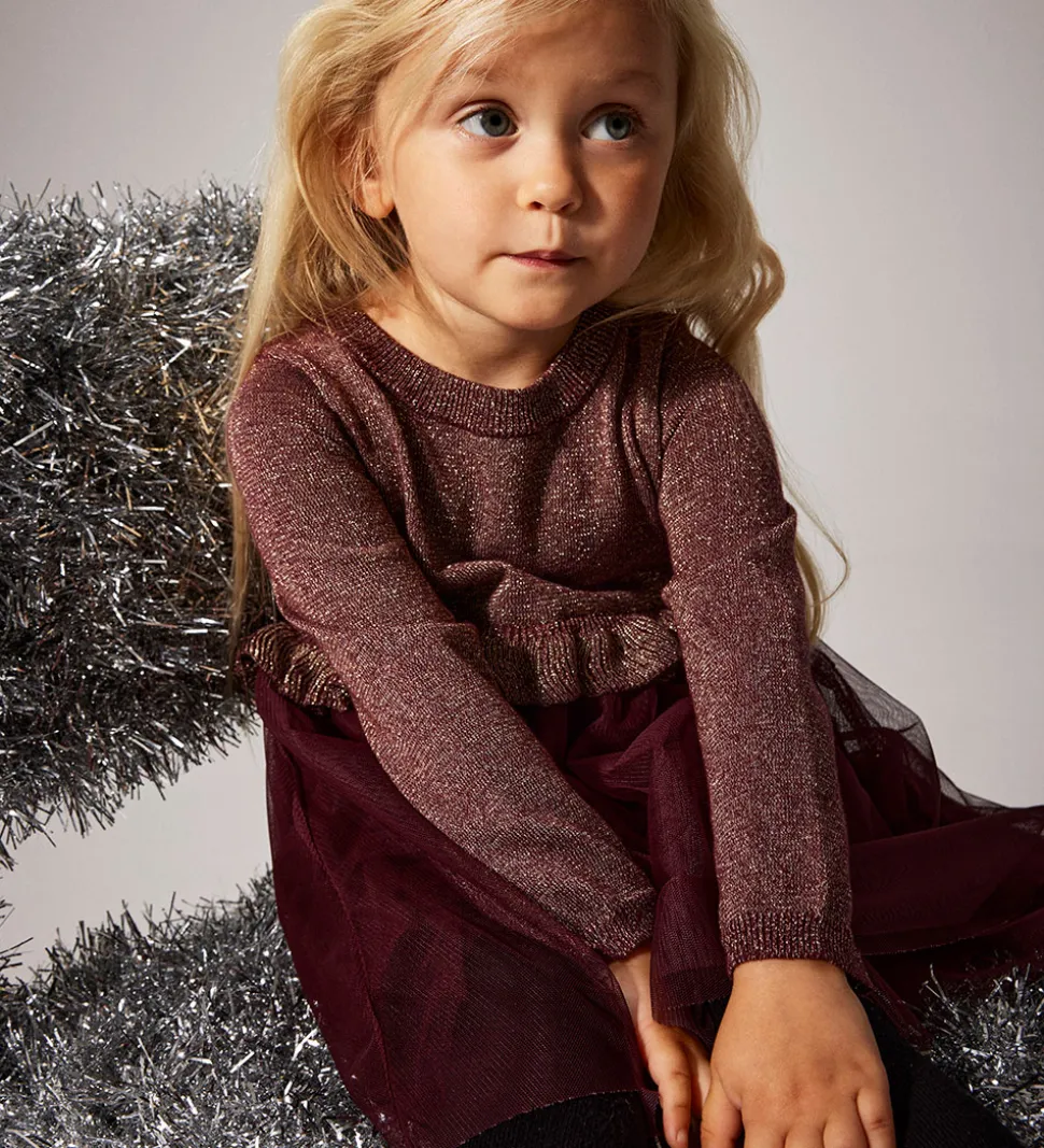 Elegant Name It kjole i en dyb bordeaux farve. Kjolen har lange ærmer og en overdel med en strikket struktur og med glimmer, der komplementeres af et skørt af tyl. Flæsedetaljen ved taljen giver et flot udtryk. Name It kjolen fremstår med en rund halsudskæring.