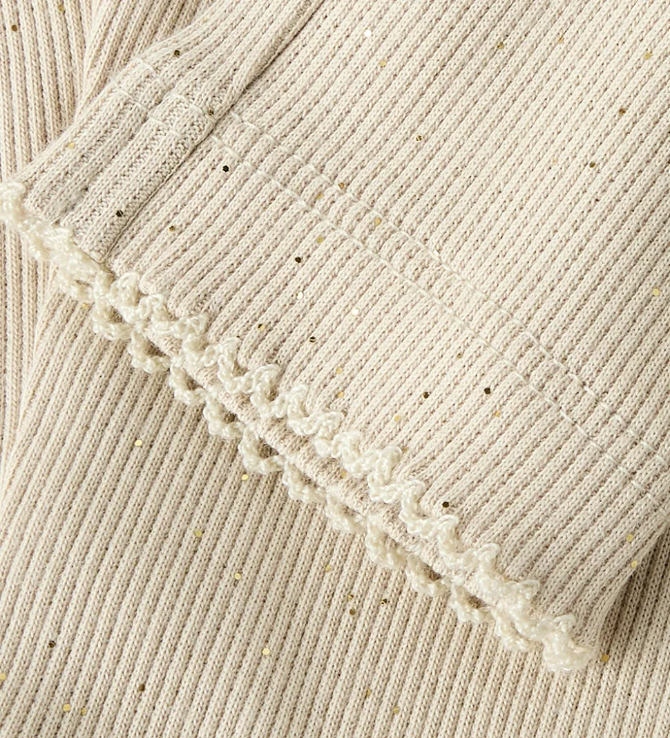 Elegante Name It leggings i en lys beige farve med en subtil ribstruktur og små skinnende prikker. Name It leggingsene har en elastisk Kant i livet, der sikrer en god pasform.