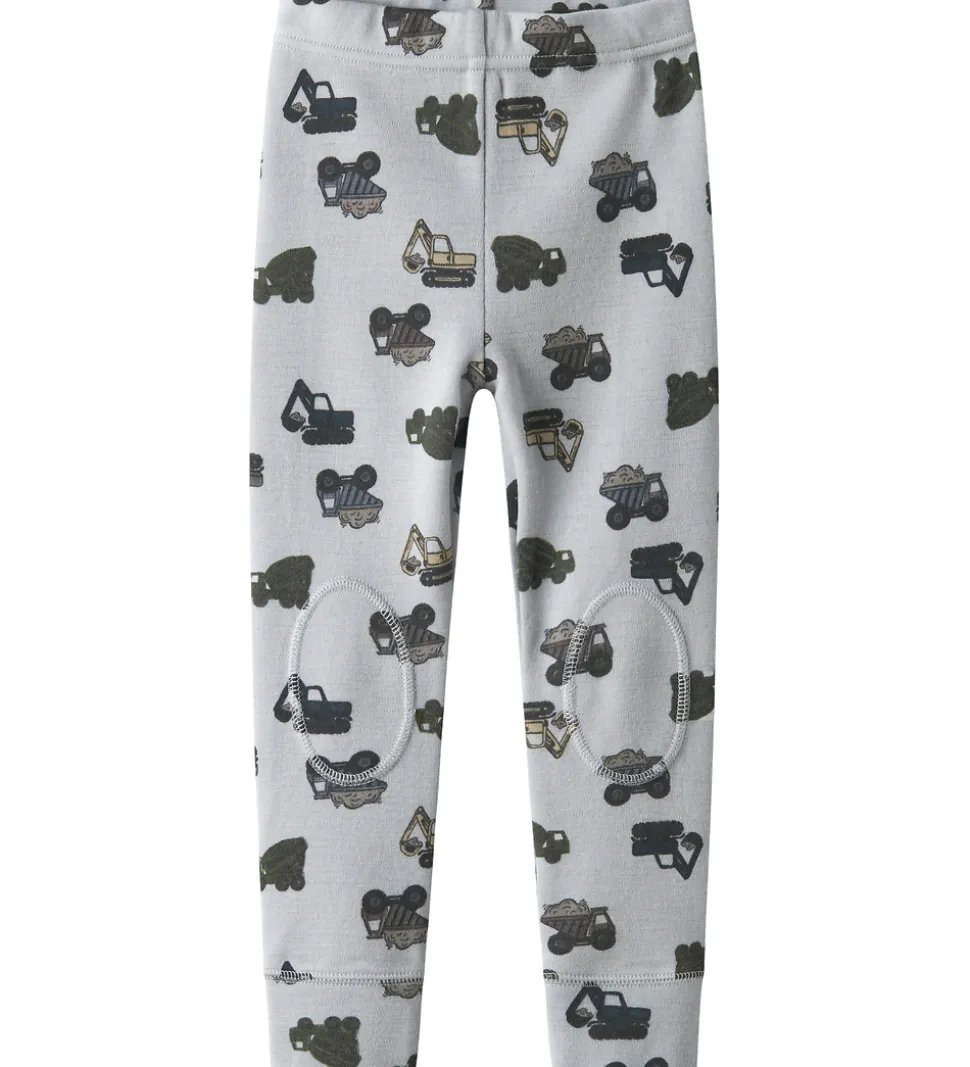 Smarte Name It leggings i lyseblå med alloverprint af arbejdsmaskiner. Name It leggingsene har elastik i taljen, og brede kanter ved anklerne, som sikrer en god pasform. Ved knæene er der et ekstra lag stof, som gør legginsene ekstra slidstærke. Legginsene er fremstillet af merinould.