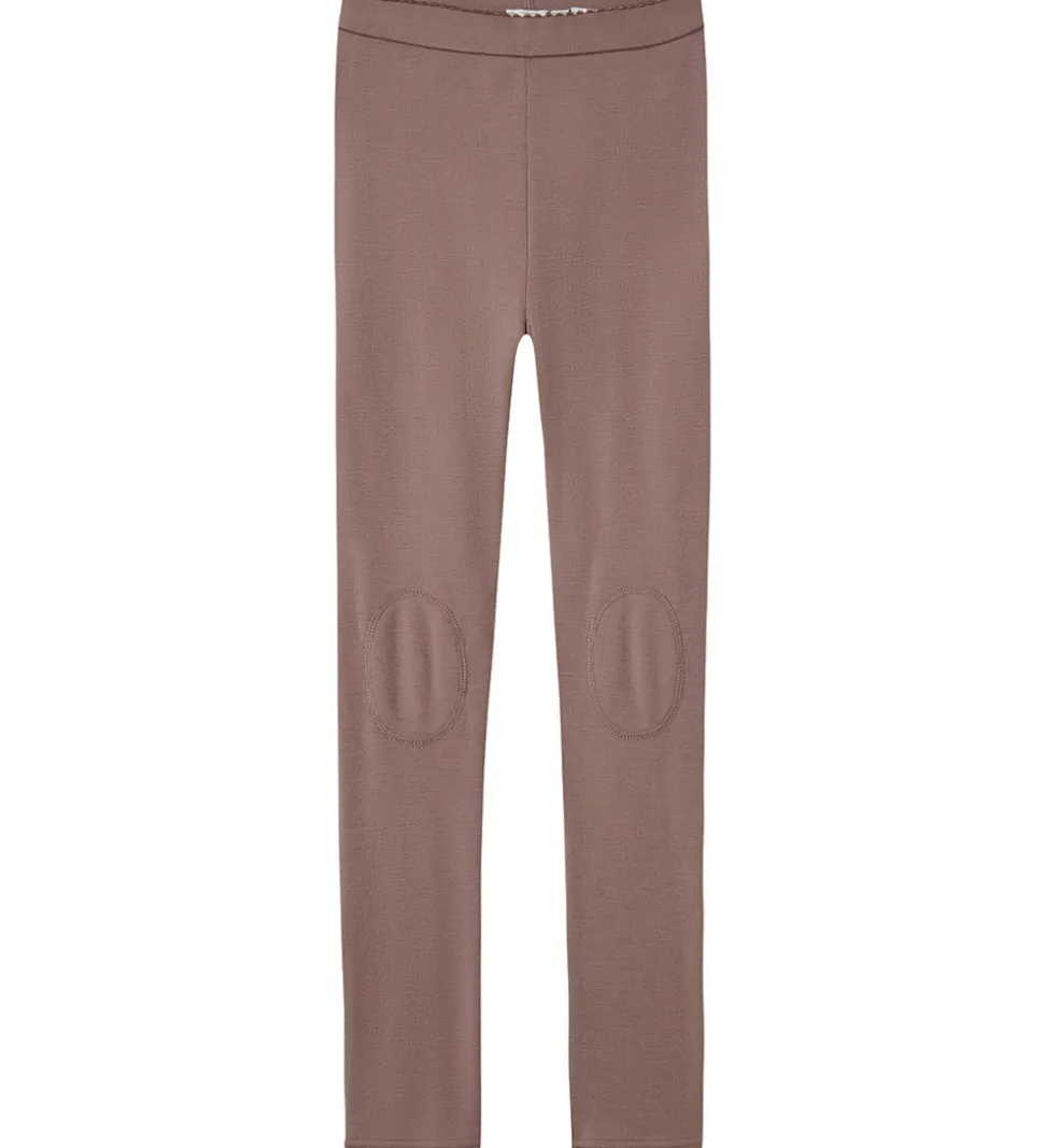 Bløde Name It leggings i støvet rosa. Name It leggings har en elastisk talje med en fin bølget kant og dekorative syninger på knæene. Legginsene er fremstillet af blødt merinould.