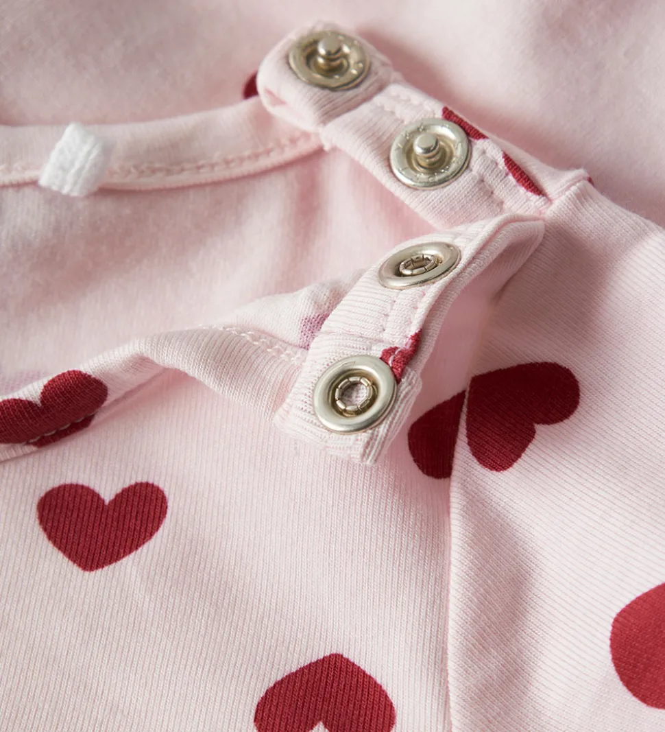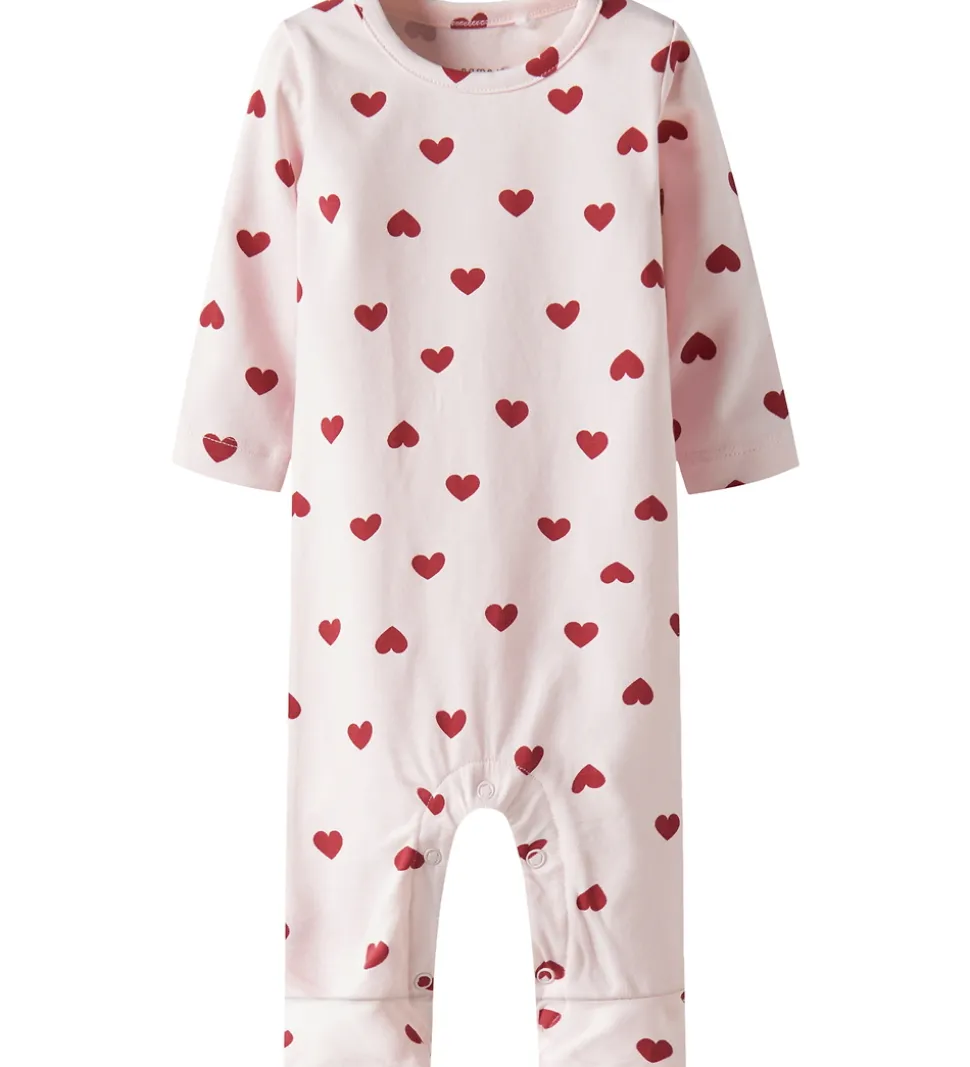 Charmerende Name It natdragt i rosa med alloverprint af røde hjerter. Natdragten har lange ærmer og lange ben med mulighed for ombuk til lukkede fødder. Den lukkes med trykknapper ved venstre skulder og mellem benene.