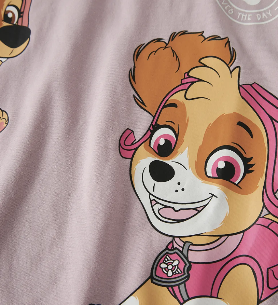 Farverig Name It natkjole i rosa med print af tre karakterer fra Paw Patrol. Natkjolen har en rund halsudskæring og lange ærmer med rynker ved skuldrene. Pasformen er løs og behagelig.