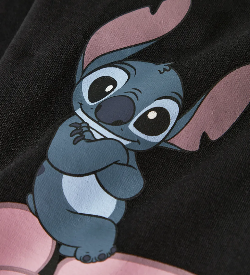 Charmerende Name It nattøj bestående af en langærmet natbluse og et par natbukser i sort med stort Stitch-print. Natblusen har en rund halsudskæring med en smal ribkant. Natbukserne har en god elastik i taljen og ribkanter ved anklerne.