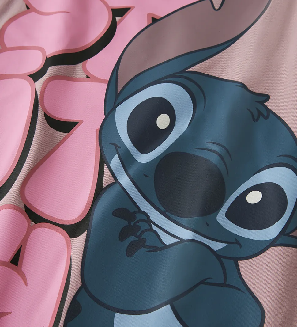 Skønt Name It nattøj bestående af en langærmet natbluse og et par natbukser i rosa med stort Stitch-print. Natblusen har en rund halsudskæring med en smal ribkant. Natbukserne har en god elastik i taljen og ribkanter ved anklerne.