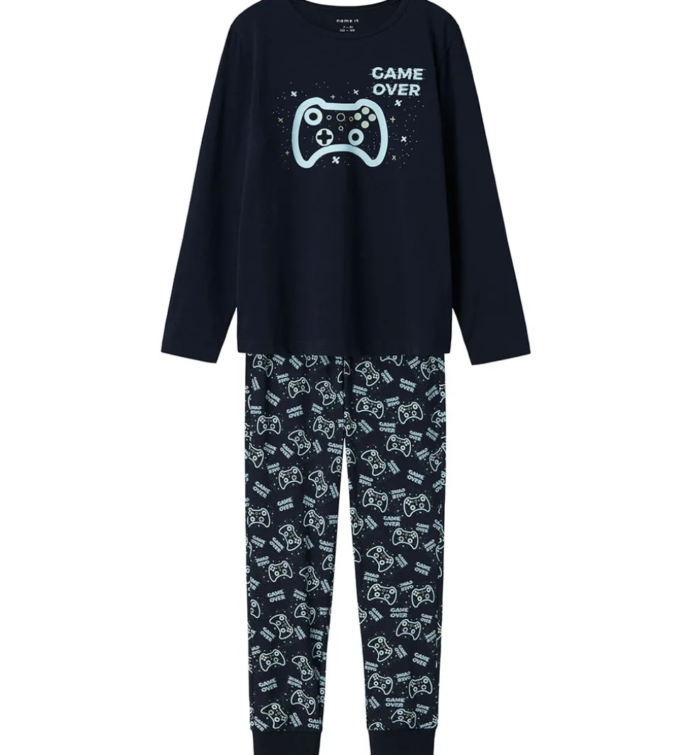 Skønt Name It nattøj, som er 2-delt med en natbluse i navyblå med et gaverprint på fronten samt et par natbukser i navyblå med et allover-gamerprint, der sikrer en god nat.