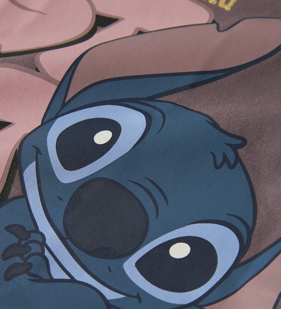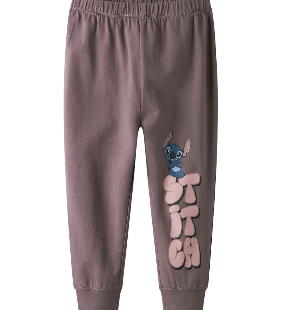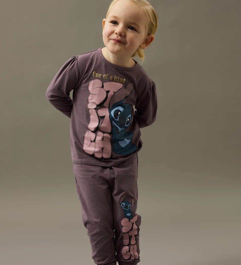 Fint Name It nattøj i støvet mørkelilla med et stort print på maven og venstre ben af Stitch. Nattøjet består af en natbluse med pufærmer og et par natbukser med lange ben og elastik i taljen.