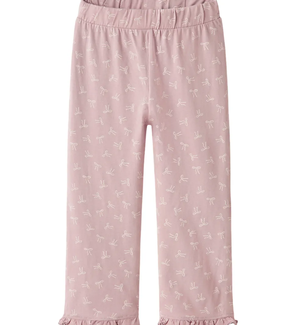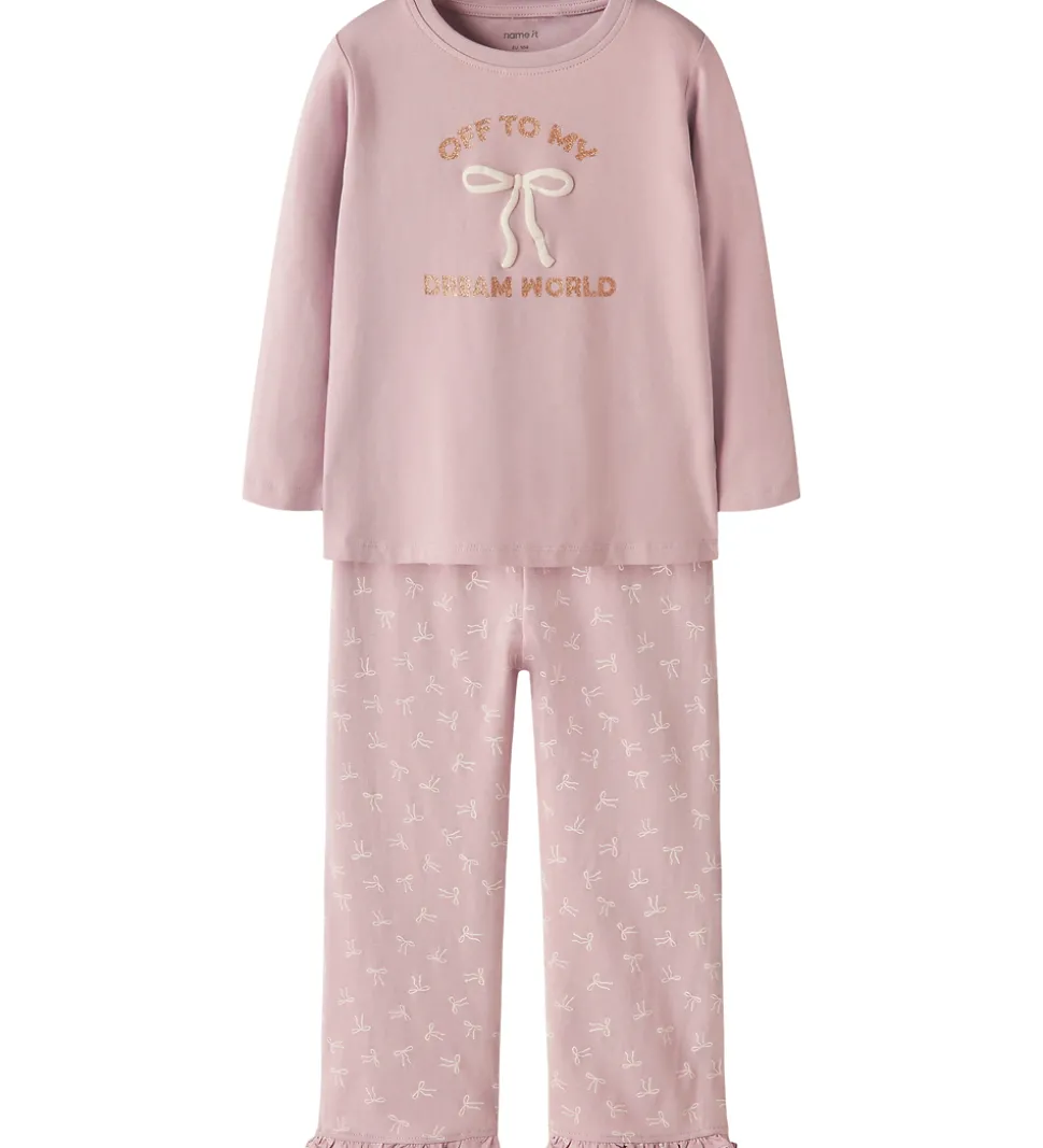 Skønt Name It nattøj 2-delt sæt i en smuk lyserød nuance. Blusen har lange ærmer og et charmerende print med teksten “Off To My Dream World” i guld. Bukserne er dekoreret med små sløjfeprint.