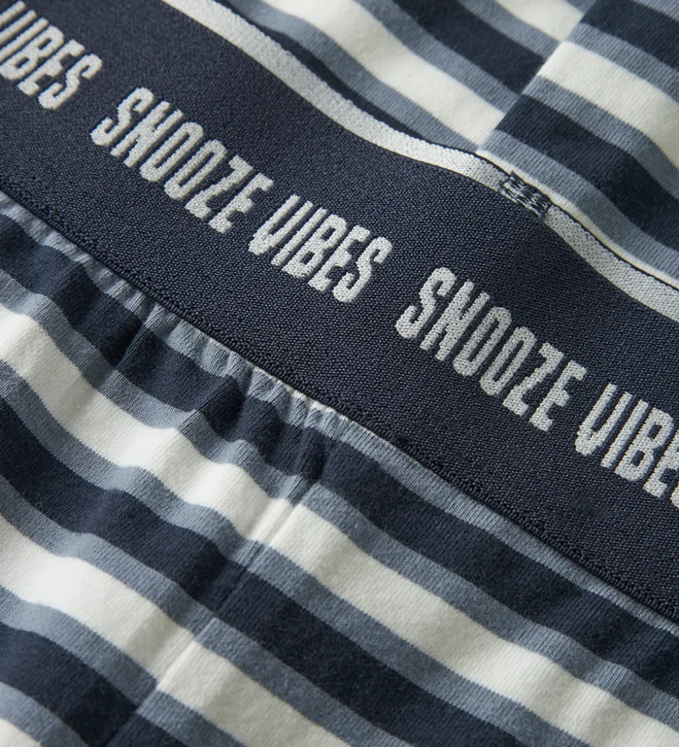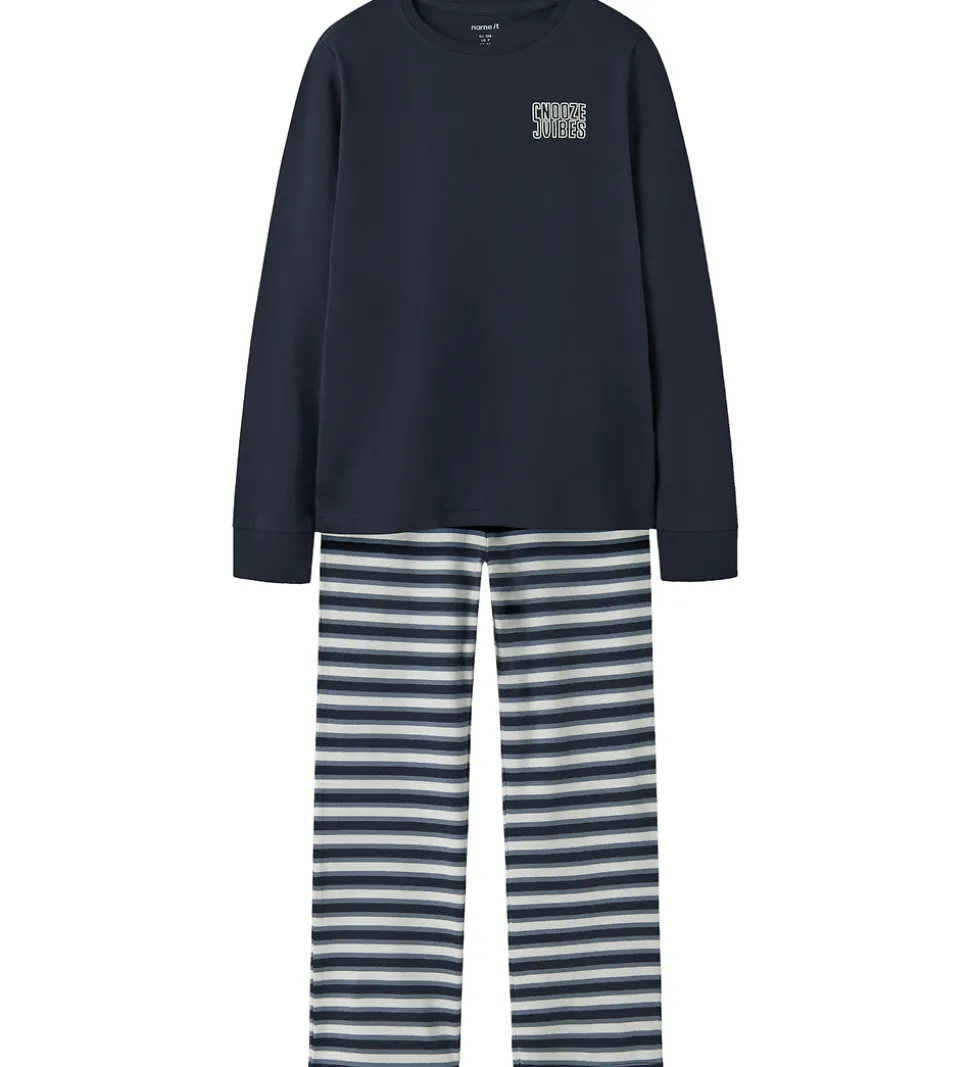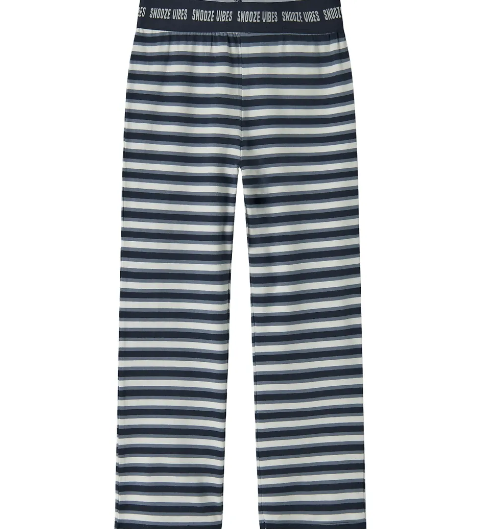 Blusen er navyblå med et hvidt print på brystet og bagsiden. Natbukserne har et klassisk, stribet mønster i hvide og blå nuancer der komplimenterer overdelen, samt en elastisk talje, der sikrer en god pasform.