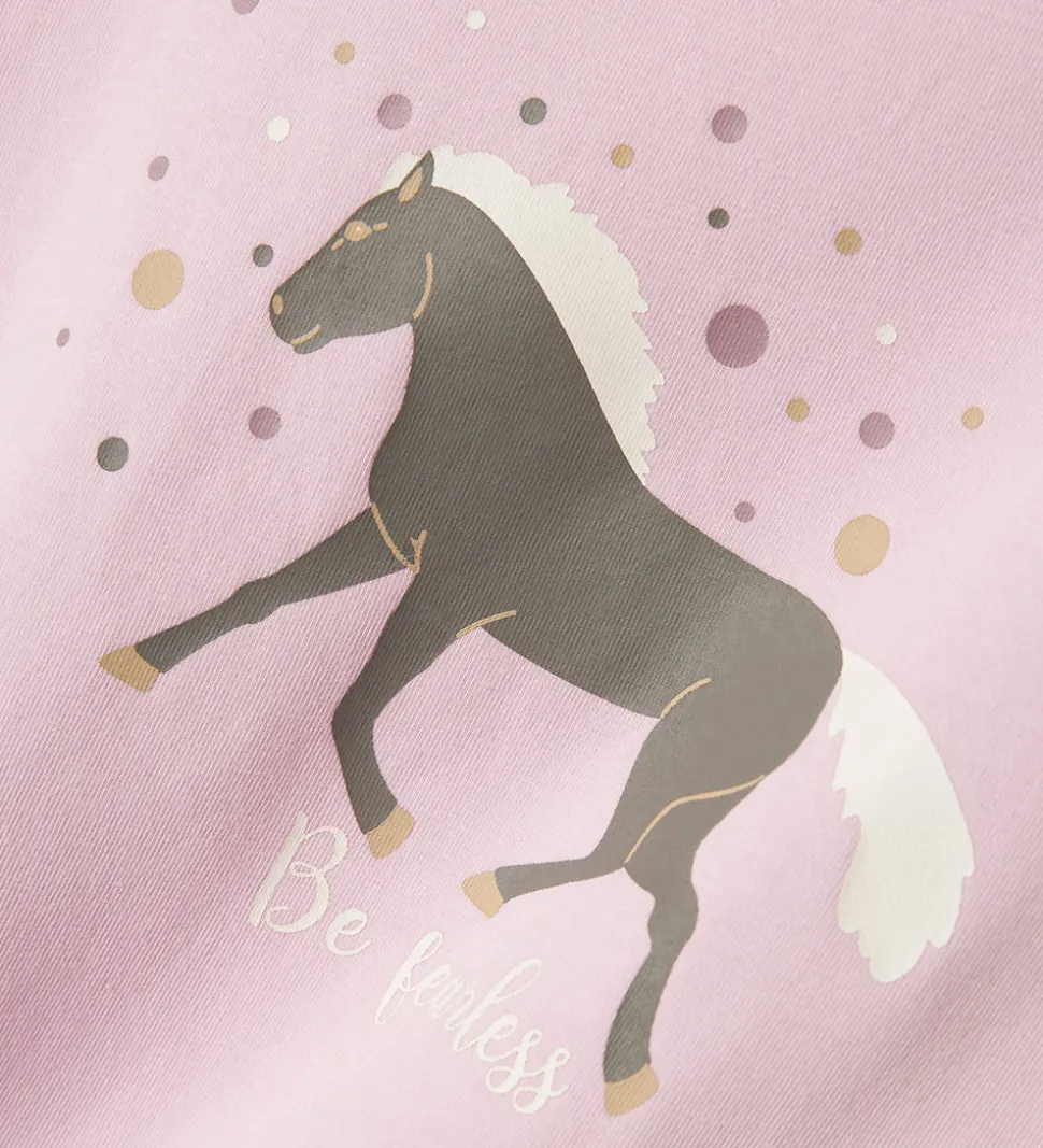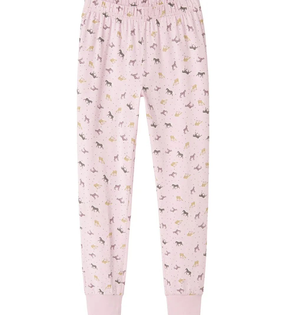 Lækkert Name It nattøj, som er 2-delt og i en lys rosa med et fint hesteprint på bukserne og et sødt hesteprint på blusen. Perfekt til en god nats søvn.