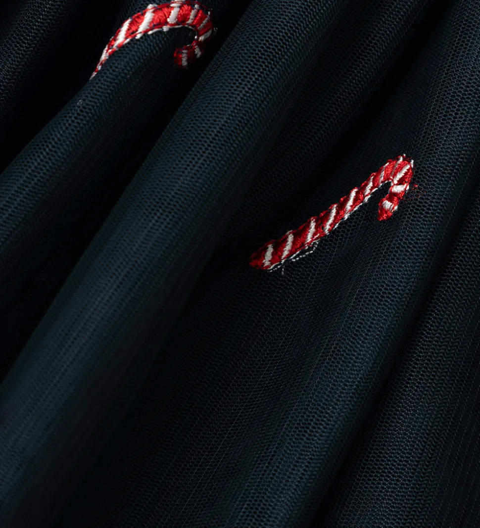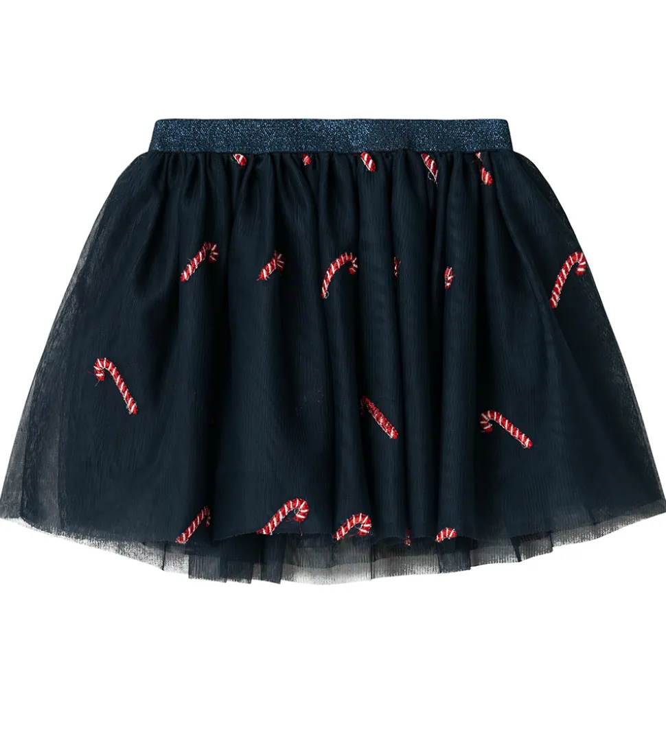Charmerende Name It nederdel i en mørk blå farve med festligt slikstænger-print i rød og hvid. Nederdelen har en elastisk talje, der sikrer en god pasform og komfort hele dagen.