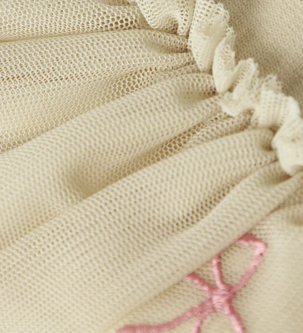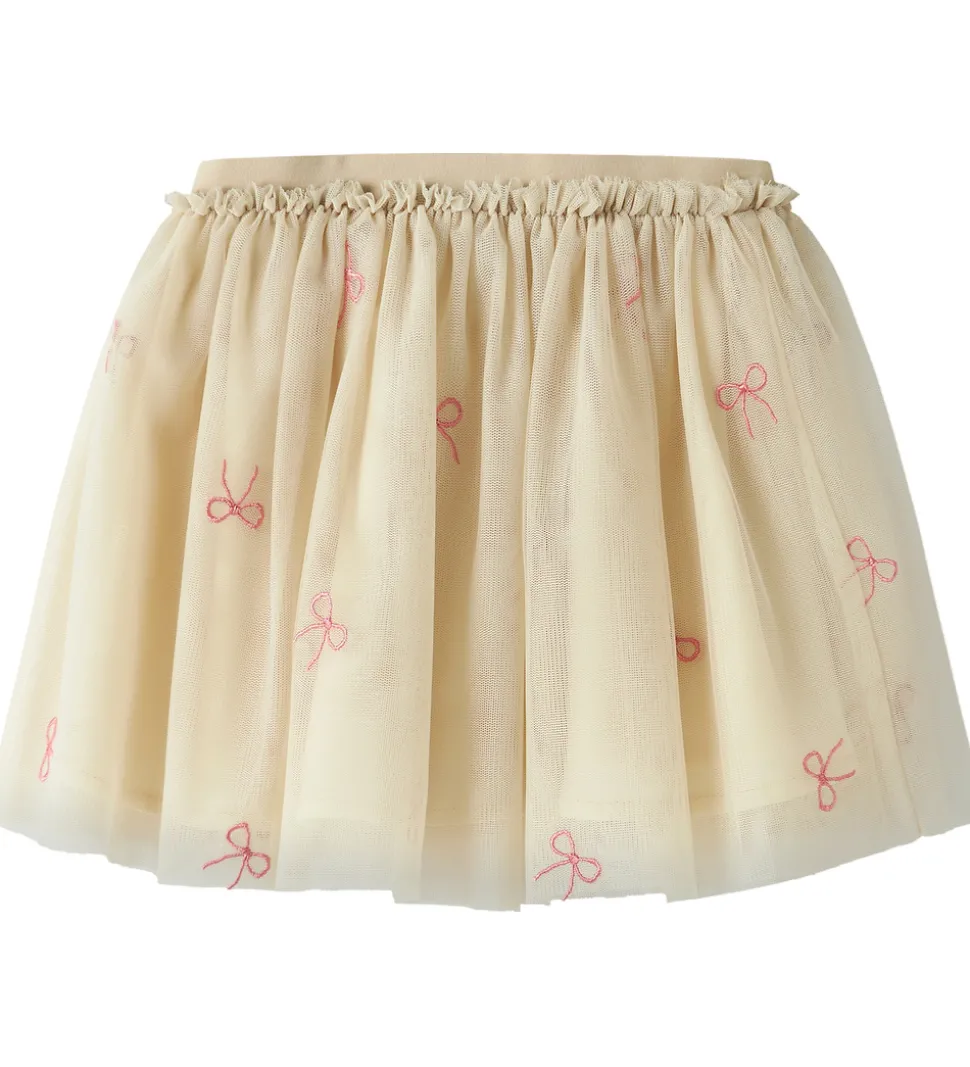 Fin Name It nederdel i beige med små, broderede sløjfer i rosa. Nederdelen har en god elastik i taljen, og består af et lag genanvendt polyester inderst og to lag tyl udenpå.